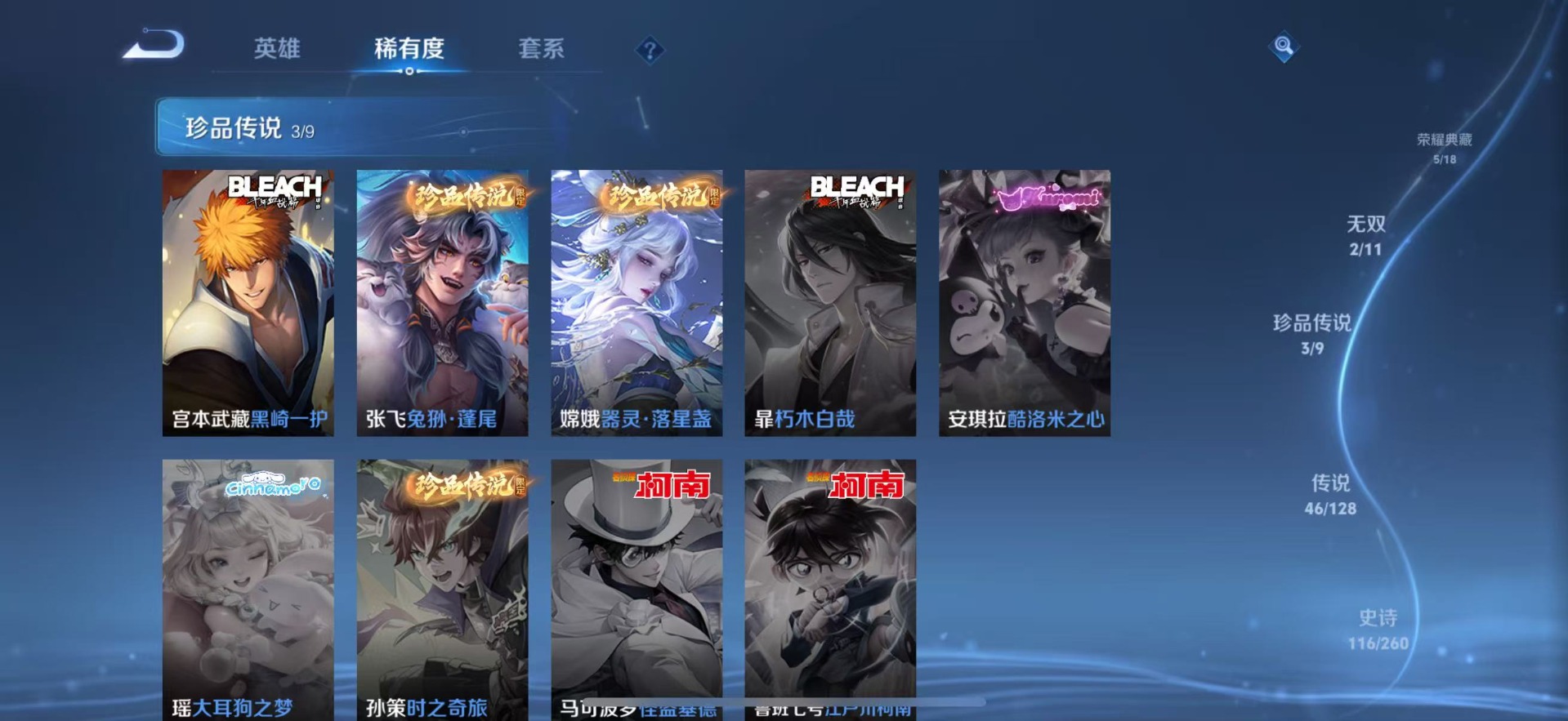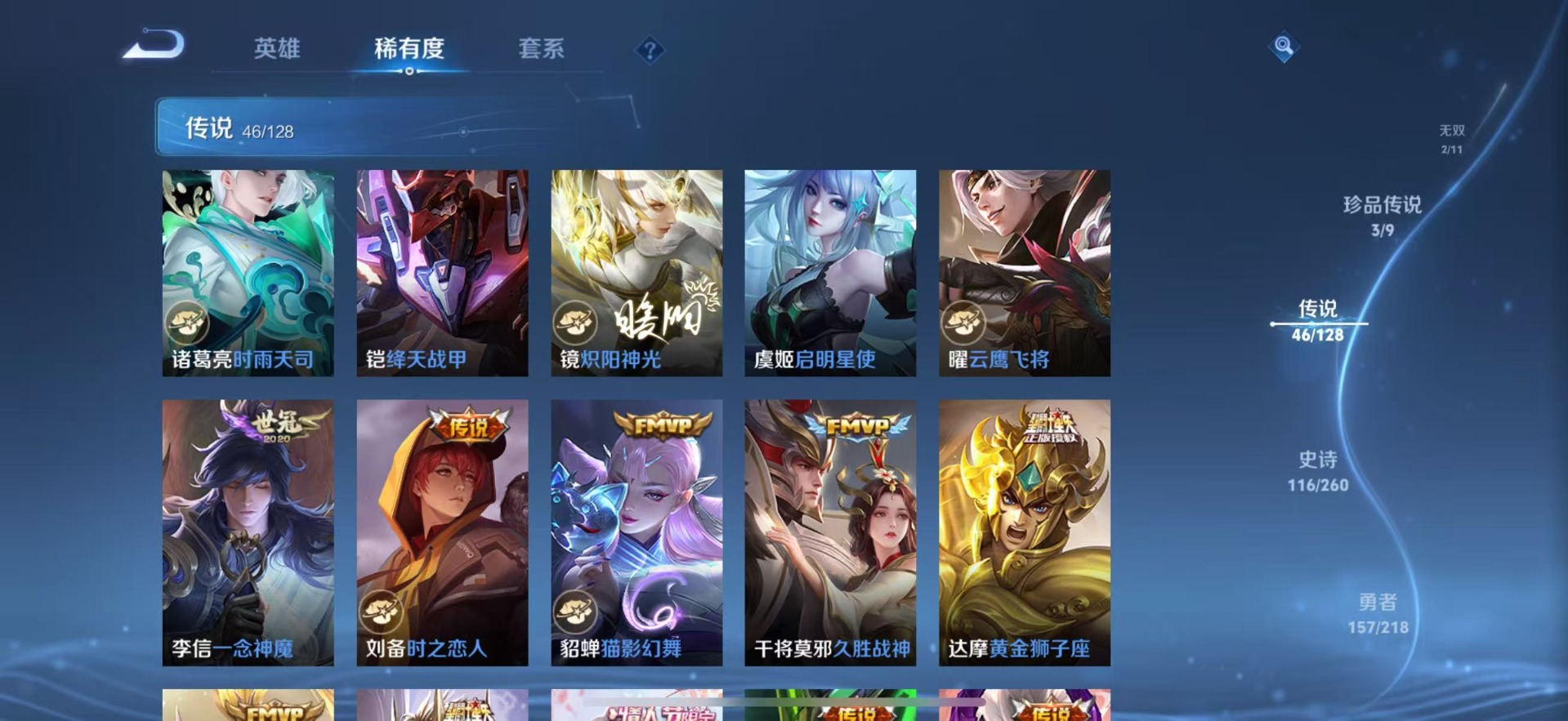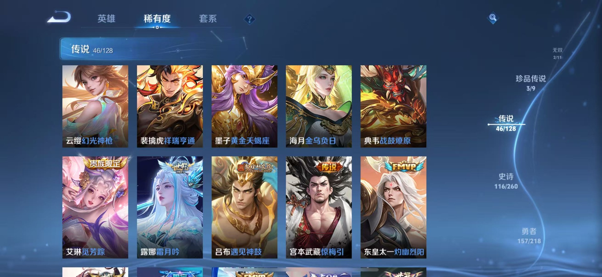 铠绛天战甲,刘备时之恋人,赵云淬星耀世,干将莫邪久胜战神,典韦战鼓燎原,小乔音你心动,李信一念神魔,孙策挚爱之约,达摩黄金狮子座,海月金乌负日,王昭君乞巧织情,露娜霜月吟,吕布遇见神鼓,后羿千劫归真,镜炽阳神光,周瑜音你心动,宫本武藏惊梅引,裴擒虎祥瑞亨通,貂蝉猫影幻舞,艾琳觅芳踪,西施续相思,曜云鹰飞将,曜李逍遥,马超无双飞将,墨子黄金天蝎座,云缨幻光神枪