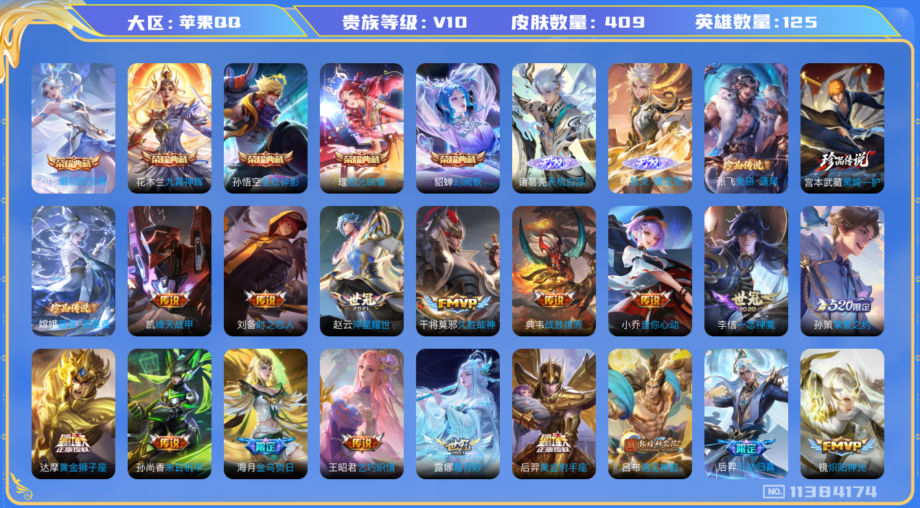 [11384174]V10 5典藏 2无双 3珍品传说 46传说 125英雄 409皮肤 可修改实名 优质装备:全息碎影(猴子典藏),九霄神辉(木兰典藏),幻阙歌(貂蝉典藏),拾光映像(瑶典藏),器灵·螭龙剑,最初的交响(伽罗典藏),天机白泽,器灵·落星盏,黑崎一护,黄金狮子座,黄金射手座,冠军飞将,云鹰飞将(小将军),绛天战甲(鸡嘴战神),猫影幻舞,久胜战神,炽阳神光,一念神魔,末日机甲-孙尚香(绿蚂蚱),音你心动-小乔,地狱之眼,音你心动-周瑜,李逍遥,乞巧织情,时之恋人-刘备(电焊工),淬星耀世,超时空战士-狄仁杰,挚爱之约,无双飞将,灼幽烈阳,惊梅引,遇见神鼓,霜月吟,艾琳觅芳踪,金乌负日,黄金天蝎座,千劫归真 珍品传说:兔狲·蓬尾 传说皮:典韦战鼓燎原,九山相柳,云诺千山,续相思,祥瑞亨通,幻光神枪 珍宝阁皮:优雅恋人,蔷薇恋人,玩趣恶龙 限定皮:愿照·九州拓(澜年限),愿照·福禄聚(蔡文姬年限),愿照·岁时盈(虞姬年限),愿照·山河定(司空震年限),愿照·众生和(妲己年限),愿照·千秋盛(女娲年限),武陵仙君(小桃花),傲雪梅枪,时雨天司(水龙头),神威(电光马子),高山流水,诗剑行,匿光决锋者,降魔,五谷丰年,青龙志(铠年限),冰锋战神,游园惊梦,御风骁将(吕布年限),逐梦之音,祈雪灵祝(雪兔子),李小龙,如梦令-后羿,猪悟能,引擎之心,百木心枪,玉兔公主,深海之息(深海大菠萝),冰霜神祇 史诗皮:赞萌露比,鸭鸭历险记-刘禅,器灵·浮梦炉,糖绘人间,狼魂孤将,化蝶舞,星界战将,龙之律动,雪豹·霜爪,石田雨龙,百相守梦-周瑜,茶境仙,蔬乡物语(鲁班七号),百相守梦-黄忠,守夜人,遇见神鹿,紫霞仙子,苍穹之光,电玩小子(小书包),黄金分割率,特工魅影,千年之狐,永昼,江河有灵,匿光侦查者,鹤归松栖(赵怀真),魅语,百解令(蒙犽),高渐离燃音魔法,蒙恬荣光圣徽,冰冠公主,青蛇,偶像歌手,白蛇,晚萤,百相守梦(刘备),暗夜猫娘,银翎春语,龙骑士(小龙虾),末日机甲-吕布,猫狗日记-孙策,猫狗日记-大乔,乱世虎臣,节奏热浪,修罗,女仆咖啡,摇滚巨星,水果甜心,绅士熊喵,天才门将,星夜王子,心灵骇客,功夫厨神,德古拉伯爵,暗隐猎兽者,幽灵船长,鬼剑武藏,心灵战警,乐园奇幻夜,天秀·启明,舞动绿茵,地狱岩魂,纤云弄巧,拒霜思,缤纷独角兽,乘风破浪,逐浪之夏,水晶猎龙者,曙光守护者,