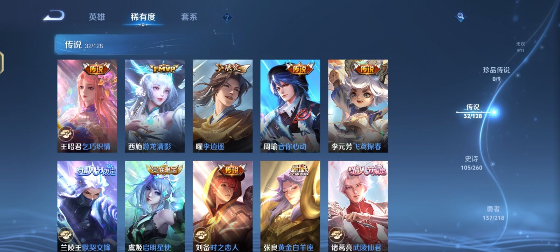 - PX_2094461-32 安卓QQ/尊贵铂金/300皮肤/122英雄/1典藏/0珍品无双/0无双/0珍品传说/20传说/83史诗/8稀有英雄 【1 典藏皮肤】鸣剑·曳影 李白, 【20 传说皮肤】启明星使 虞姬,无双飞将 马超,云鹰飞将 曜,齐天大圣 孙悟空,武陵仙君 诸葛亮,炽阳神光 镜,遇见神鼓 吕布,曦玄引 吕布,怒海麟威 吕布,时之恋人 刘备,久胜战神 干将莫邪,末日机甲 孙尚香,末日机
