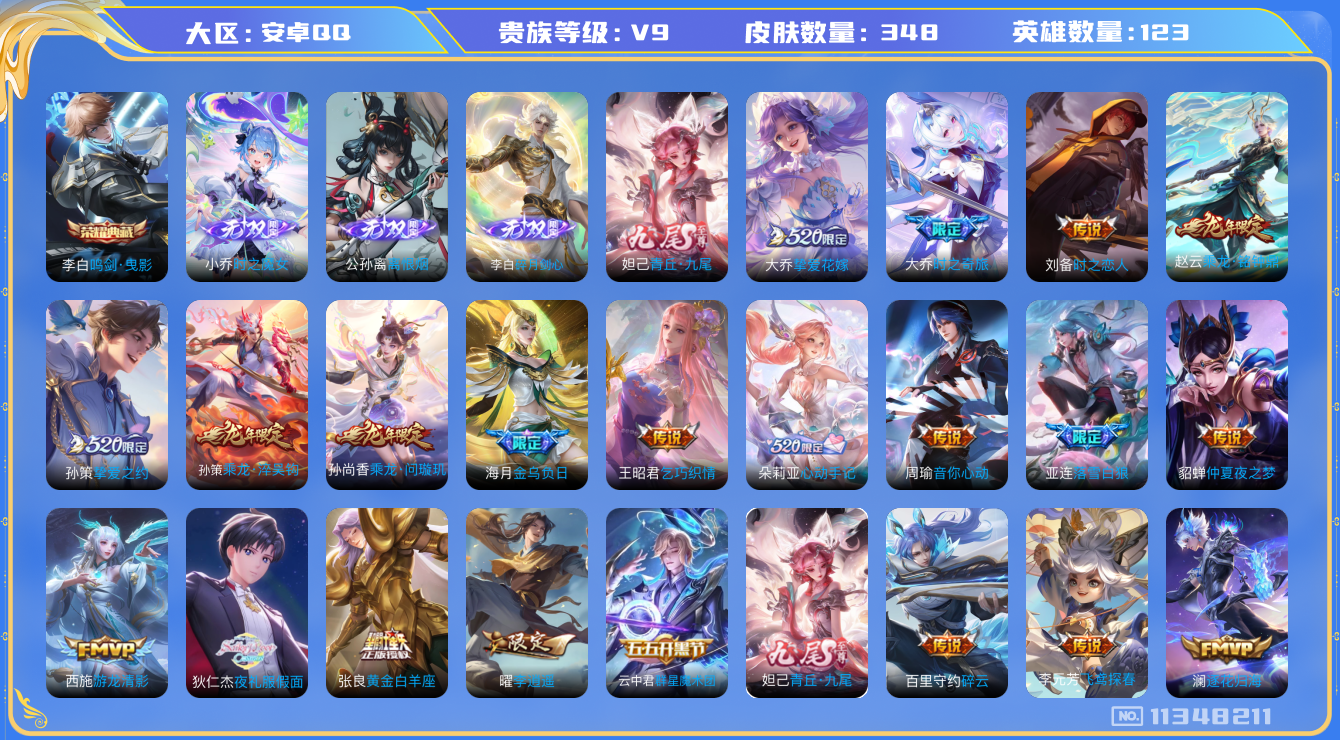 [11348211]V9 1典藏 4无双 32传说 123英雄 348皮肤 可修改实名 优质装备:鸣剑·曳影,青丘·九尾(妲己无双),碎月剑心(李白无双),小乔时之魔女(小乔无双),离恨烟(公孙离无双),黄金白羊座,仲夏夜之梦(大飞蛾),飞鸢探春,音你心动-周瑜,李逍遥,乞巧织情,时之恋人-刘备(电焊工),游龙清影(小青龙),花朝如约(花篮子),挚爱之约,挚爱花嫁,碎云,青丘·九尾,鹤归松栖(云缨),大乔-时之奇旅,永恒水手月亮,夜礼服假面,澜逐花归海,金乌负日,云中君群星魔术团,朵莉亚心动手记 传说皮:乘龙·问璇玑(孙尚香年限),乘龙·铭钟鼎(赵云年限),乘龙·淬吴钩(孙策年限),貂蝉曦玄引,落雪白狼 珍宝阁皮:蔷薇恋人,女武神 限定皮:鸣野蒿,凤求凰(白切鸡),凤凰于飞,武陵仙君(小桃花),星穹之声,白鹤梁神女,魔法小厨娘,玄嵩(庄周年限),山海·碧波行(瑶年限),至美·乘鲤谣,五谷丰年,幽恒(沐浴露),李小龙,如梦令-嫦娥,奇迹圣诞,默契交锋-兰陵王,默契交锋-花木兰,孙行者,猪悟能,云端筑梦师,女儿国国王,寅虎·心曲(虎婆),时之祈愿-云中君,时之祈愿-瑶(瑶传限),玉兔公主,唐三藏,神器·万象笔 史诗皮:石田雨龙,怒海争锋,炽弈燎原,撼地雄心,破空之剑,涂山红红,东方月初,埋骨钱,芈月浮光幕影,海诺心动手记,琥珀纪元伽罗,夜落电台,上官婉儿群星魔术团,奇遇星旅,蔬乡物语(鲁班七号),超元猎域,乘龙·聚宝船(安琪拉年限),乘龙·忆丹青(大乔年限),遇见神鹿,黄金分割率,特工魅影,千年之狐,江河有灵,匿光侦查者,鹤归松栖(赵怀真),雪夜绮愿(周瑜),百解令(蒙犽),高渐离燃音魔法,冰冠公主,青蛇,偶像歌手,白蛇,电玩·爆裂旋风,暗夜猫娘,银翎春语,猫狗日记-孙策,猫狗日记-大乔,乱世虎臣,节奏热浪,女仆咖啡,摇滚巨星,水果甜心,星夜王子,心灵骇客,德古拉伯爵,暗隐猎兽者,幽灵船长,鬼剑武藏,暗渊魔法,心灵战警,舞动绿茵,诗语江南,纤云弄巧,繁星吟游(呼啦呼啦),拒霜思,缤纷独角兽,乘风破浪,逐浪之夏,唤灵魅影,金属风暴,圣诞狂欢,圣诞恋歌,鹰眼统帅,暗夜贵公子,魅力维加斯,奇遇舞章,无心,未来纪元-赵云,玫瑰异探