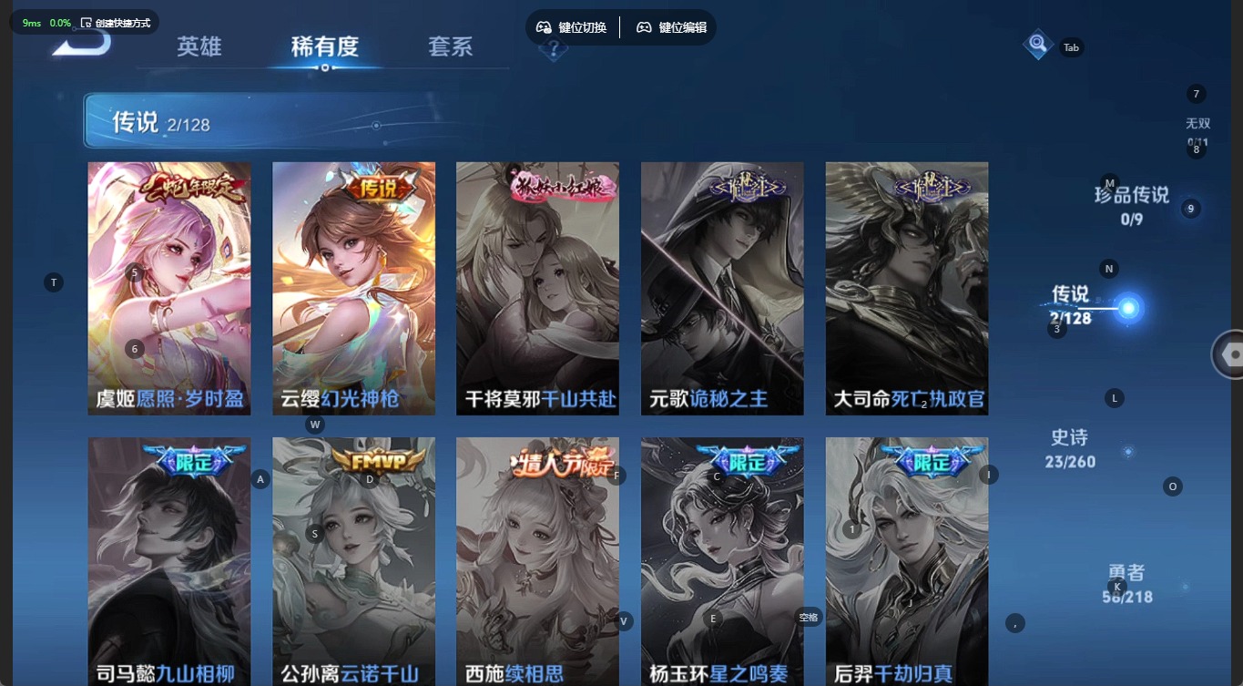 - [11519073]V6 3传说 104英雄 106皮肤 可修改实名 优质装备:超时空战士-狄仁杰,妄想实况 珍宝阁皮:妄想食味 限定皮:愿照·山河定(司空震年限),山海·碧波行(瑶年限),山海·玄木吟(马可年限) 史诗皮:龙之律动,茶境仙,紫霞仙子,特工魅影,千年之狐,百相守梦(刘备),高渐离燃音魔法,偶像歌手,冰冠公主,猫狗日记-孙策,乱世虎臣,节奏热浪,女仆咖啡,摇滚巨星,水果甜心,绅士熊喵,功夫厨神,德古拉伯爵,暗隐猎兽者,幽灵船长,缤纷独角兽,乘风破浪,逐浪之夏,水晶猎龙者,金属风暴,圣诞狂欢,鹰眼统帅,魅力维加斯