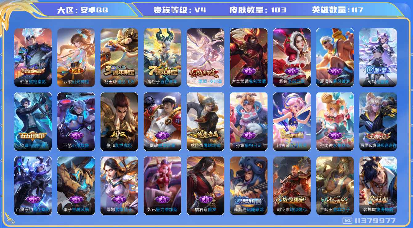 [11379977]V4 1典藏 2传说 117英雄 103皮肤 可修改实名 优质装备:弑枪猎影(韩信典藏) 传说皮:幻光神枪 珍宝阁皮:玩趣恶龙 限定皮:愿照·岁时盈(虞姬年限),遇见飞天,五谷丰年 史诗皮:化蝶舞,紫霞仙子,特工魅影,江河有灵,猫狗日记-孙策,乱世虎臣,修罗,摇滚巨星,水果甜心,鬼剑武藏,心灵战警,乘风破浪,曙光守护者,金属风暴,原初追逐者,圣诞恋歌,鹰眼统帅,魅力维加斯