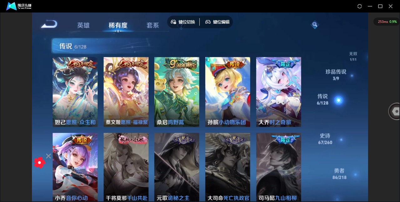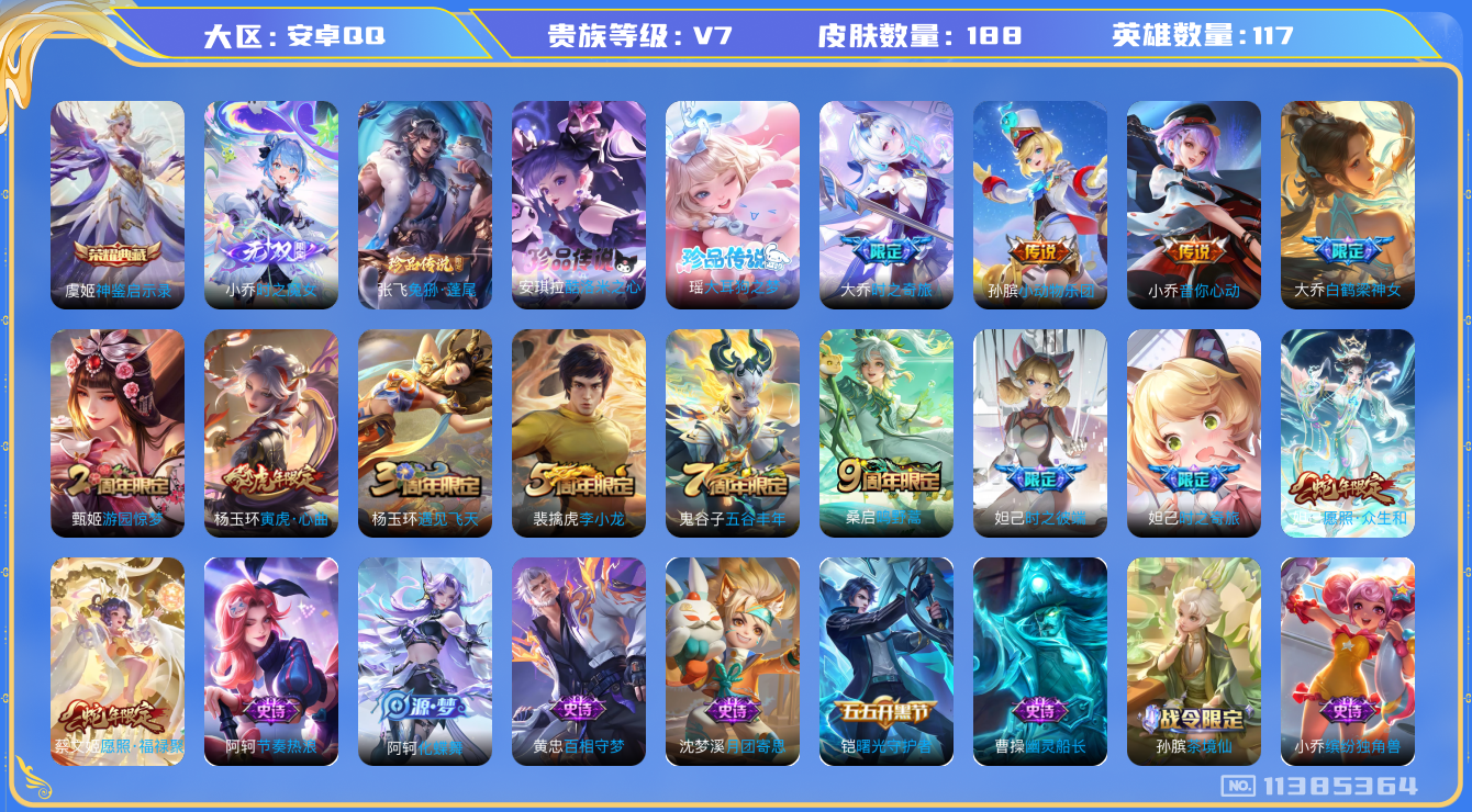 - [12234892]V7 1典藏 4传说 123英雄 269皮肤 可修改实名 优质装备:弑枪猎影(韩信典藏),云鹰飞将(小将军),一念神魔 珍宝阁皮:妄想食味,女武神 限定皮:鸣野蒿,至尊宝,白虎志(电光耗子),时之彼端,白鹤梁神女,神威(电光马子),五谷丰年,冰锋战神,天狼绘梦者,李小龙,朱雀志(守约年限),冰霜恋舞曲 史诗皮:龙之律动,百相守梦-黄忠,紫霞仙子,苍穹之光,黄金分割率,江河有灵,百解令(蒙犽),高渐离燃音魔法,冰冠公主,晚萤,电玩·爆裂旋风,末日机甲-吕布,猫狗日记-孙策,乱世虎臣,节奏热浪,摇滚巨星,水果甜心,绅士熊喵,天才门将,星夜王子,心灵骇客,德古拉伯爵,暗隐猎兽者,幽灵船长,鬼剑武藏,暗渊魔法,舞动绿茵,地狱岩魂,纤云弄巧,繁星吟游(呼啦呼啦),拒霜思,缤纷独角兽,乘风破浪,逐浪之夏,水晶猎龙者,曙光守护者,金属风暴,原初追逐者,圣诞狂欢,圣诞恋歌,鹰眼统帅,王者之锤,魅力维加斯,黎明之约,无心
