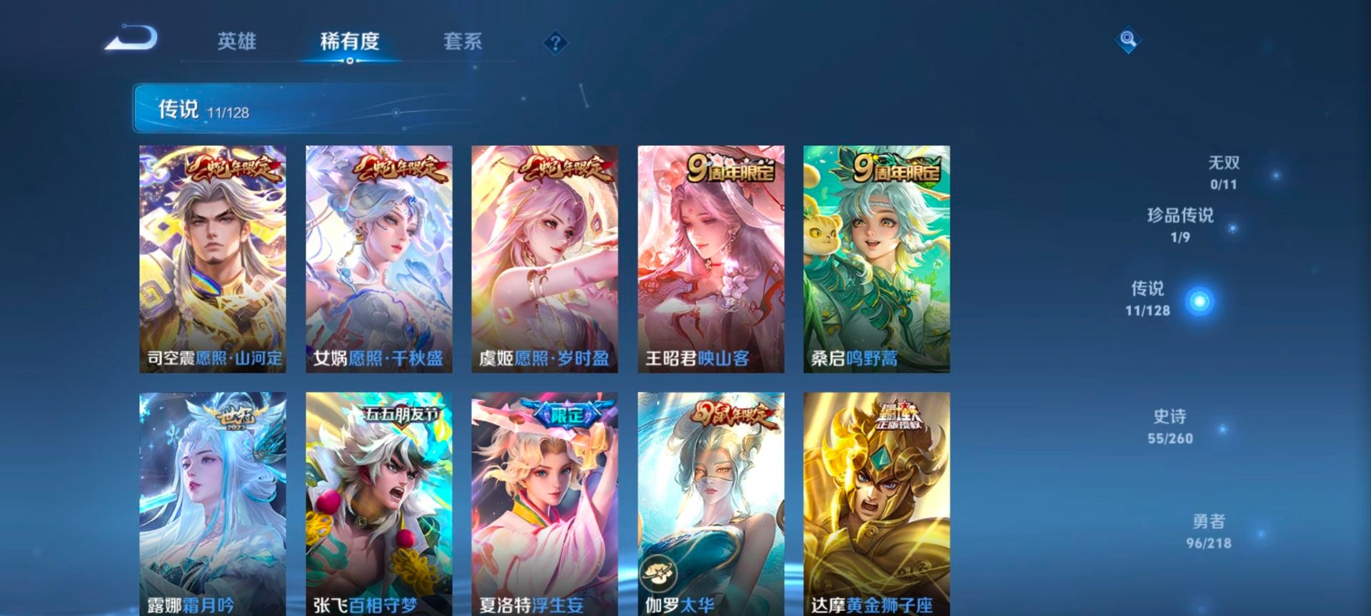 [11347918]V7 1典藏 1珍品传说 11传说 124英雄 198皮肤 可修改实名 优质装备:神鉴启示录,器灵·落星盏,黄金狮子座,超时空战士-狄仁杰,浮生妄,百相守梦(张飞),霜月吟 珍宝阁皮:妄想食味 限定皮:愿照·岁时盈(虞姬年限),愿照·山河定(司空震年限),愿照·千秋盛(女娲年限),映山客,鸣野蒿,太华(伽罗年限),李小龙,寅虎·心曲(虎婆),神器·万象笔,山海·玄木吟(马可年限) 史诗皮:器灵·浮梦炉,化蝶舞,星界战将,龙之律动,石田雨龙,茶境仙,破空之剑,蒙犽顽岩魄,海诺心动手记,夜落电台,乘龙·聚宝船(安琪拉年限),百相守梦-黄忠,织梦人,遇见神鹿,特工魅影,真我赫兹(百里守约),闲日渔趣,蒙恬荣光圣徽,冰冠公主,偶像歌手,白蛇,电玩·兔顽号,电玩·爆裂旋风,银翎春语,龙骑士(小龙虾),末日机甲-吕布,猫狗日记-孙策,猫狗日记-大乔,乱世虎臣,摇滚巨星,水果甜心,时之奇旅-安琪拉,德古拉伯爵,幽灵船长,鬼剑武藏,心灵战警,乐园奇幻夜,舞动绿茵,乘风破浪,逐浪之夏,金属风暴,鹰眼统帅,魅力维加斯,滕王阁序,千筹问战