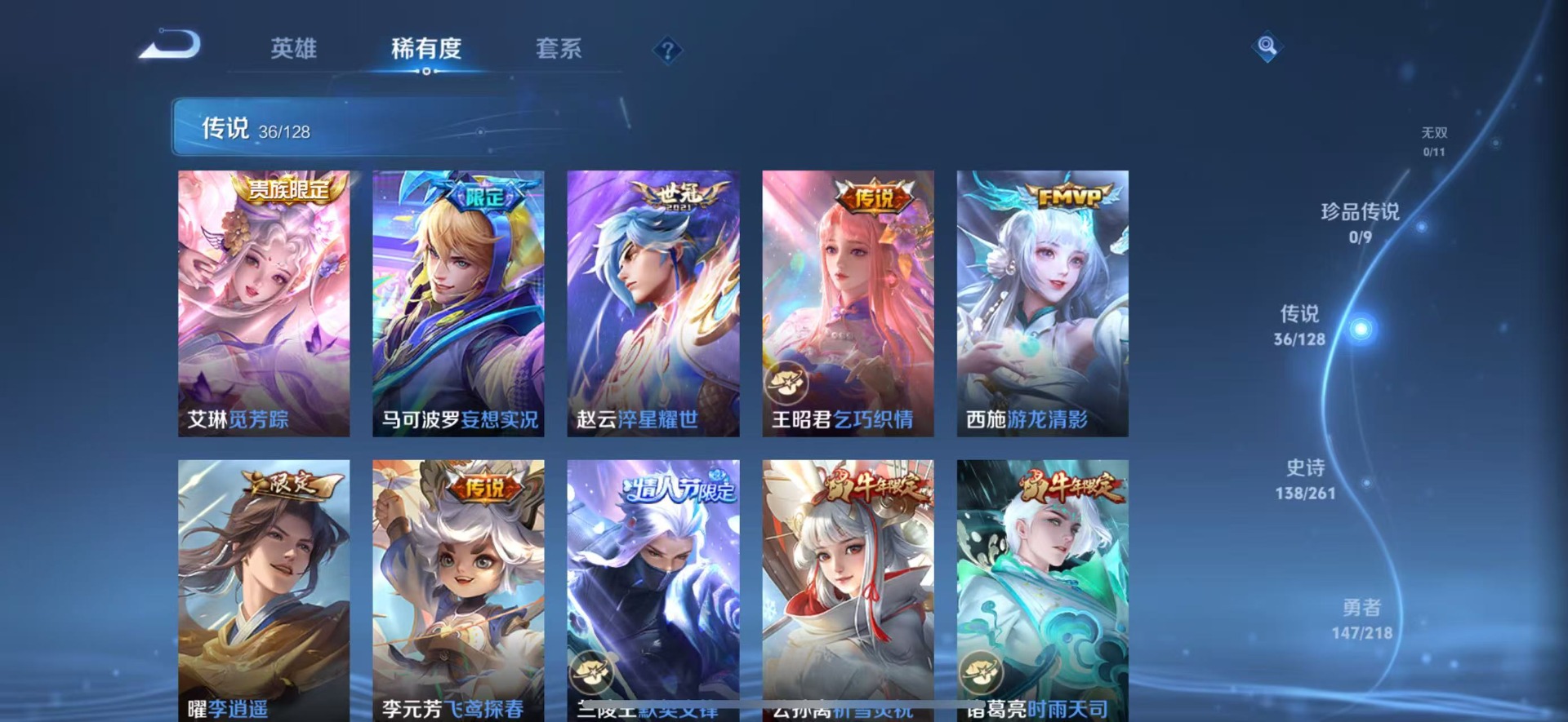 - PX_2094665-62 安卓QQ/至尊星耀/92皮肤/120英雄/0典藏/0珍品无双/0无双/0珍品传说/2传说/20史诗/6稀有英雄 【2 传说皮肤】无限倾心 项羽,至美·化雀舞 甄姬, 【20 史诗皮肤】百解令 蒙犽,雪夜绮愿 周瑜,鬼剑武藏 宫本武藏,地狱燃心 司空震,拒霜思 嫦娥,魅力维加斯 妲己,完美假期 米莱狄,舞动绿茵 蔡文姬,鹰眼统帅 狄仁杰,金属风暴 墨子,匿光侦查者 李元芳