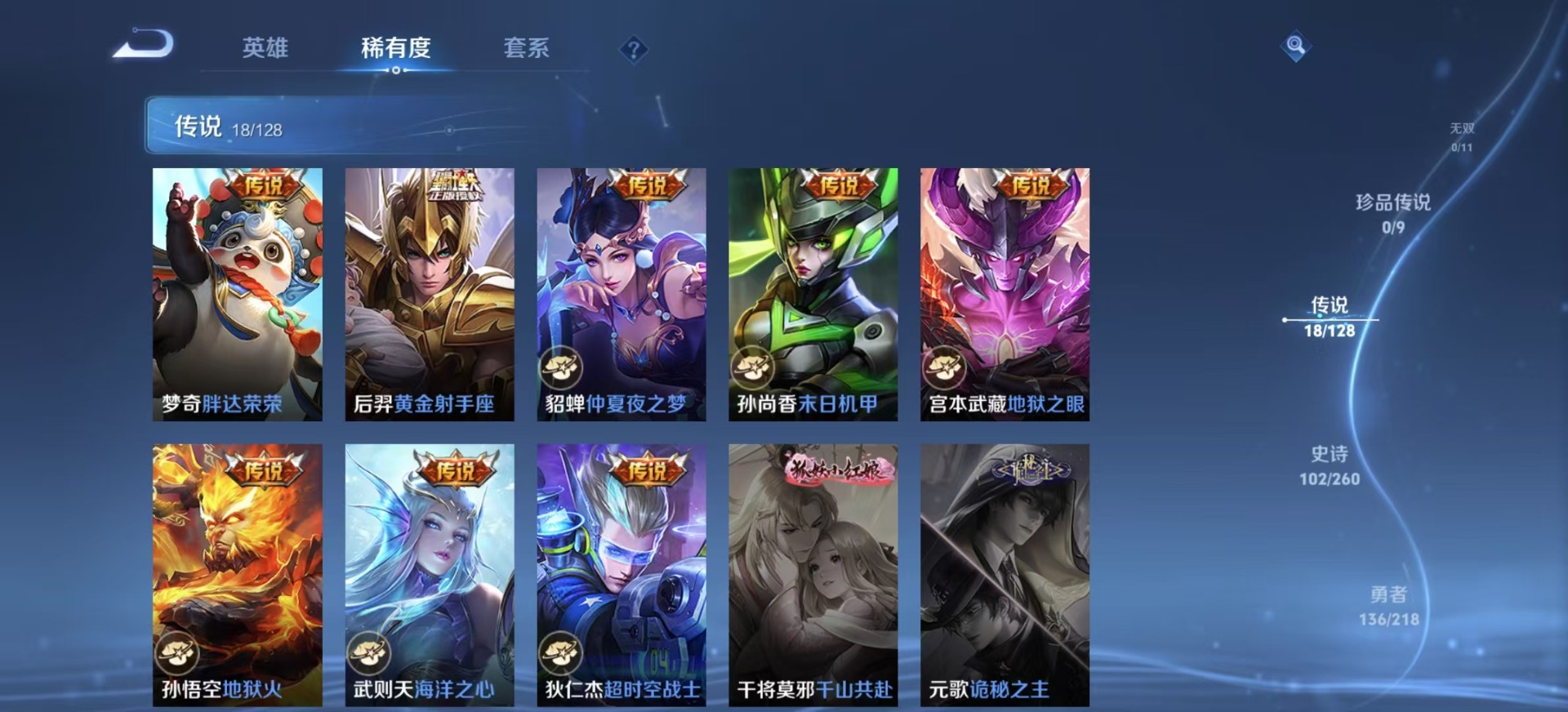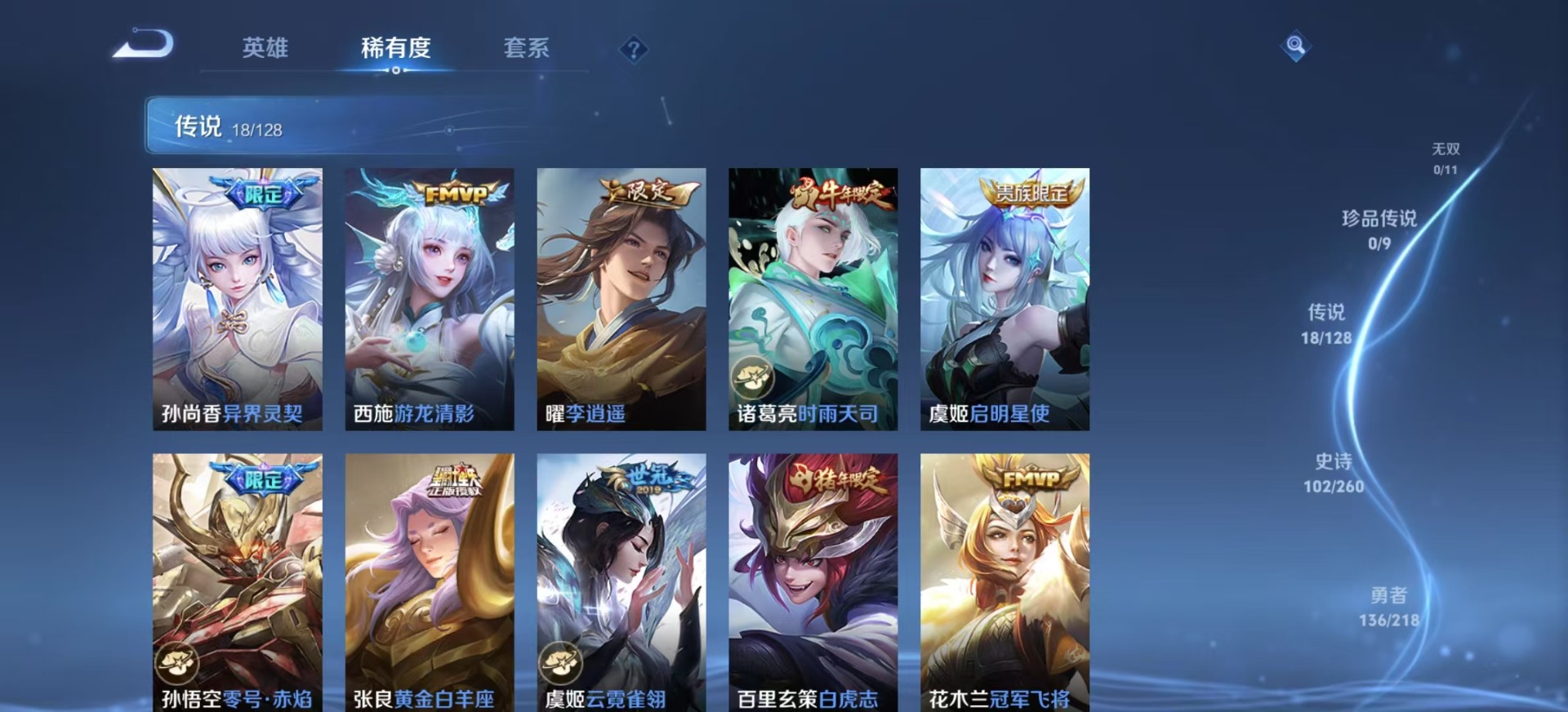 大乔白鹤梁神女,伽罗天狼溯光者,干将莫邪冰霜恋舞曲,孙尚香异界灵契,鲁班七号乒乒小将,项羽霸王别姬,后羿如梦令,露娜一生所爱,诸葛亮时雨天司,公孙离蜜橘之夏,裴擒虎李小龙,裴擒虎天狼狩猎者,东皇太一逐梦之光,上官婉儿梁祝,猪八戒猪悟能,孙悟空孙行者,孙悟空大圣娶亲,孙悟空至尊宝,百里玄策白虎志,马超神威,赵云引擎之心,妲己时之彼端,韩信傲雪梅枪,韩信飞衡,韩信逐梦之影,百里守约朱雀志,蔡文姬奇迹圣诞,虞姬霸王别姬,嫦娥如梦令,关羽冰锋战神