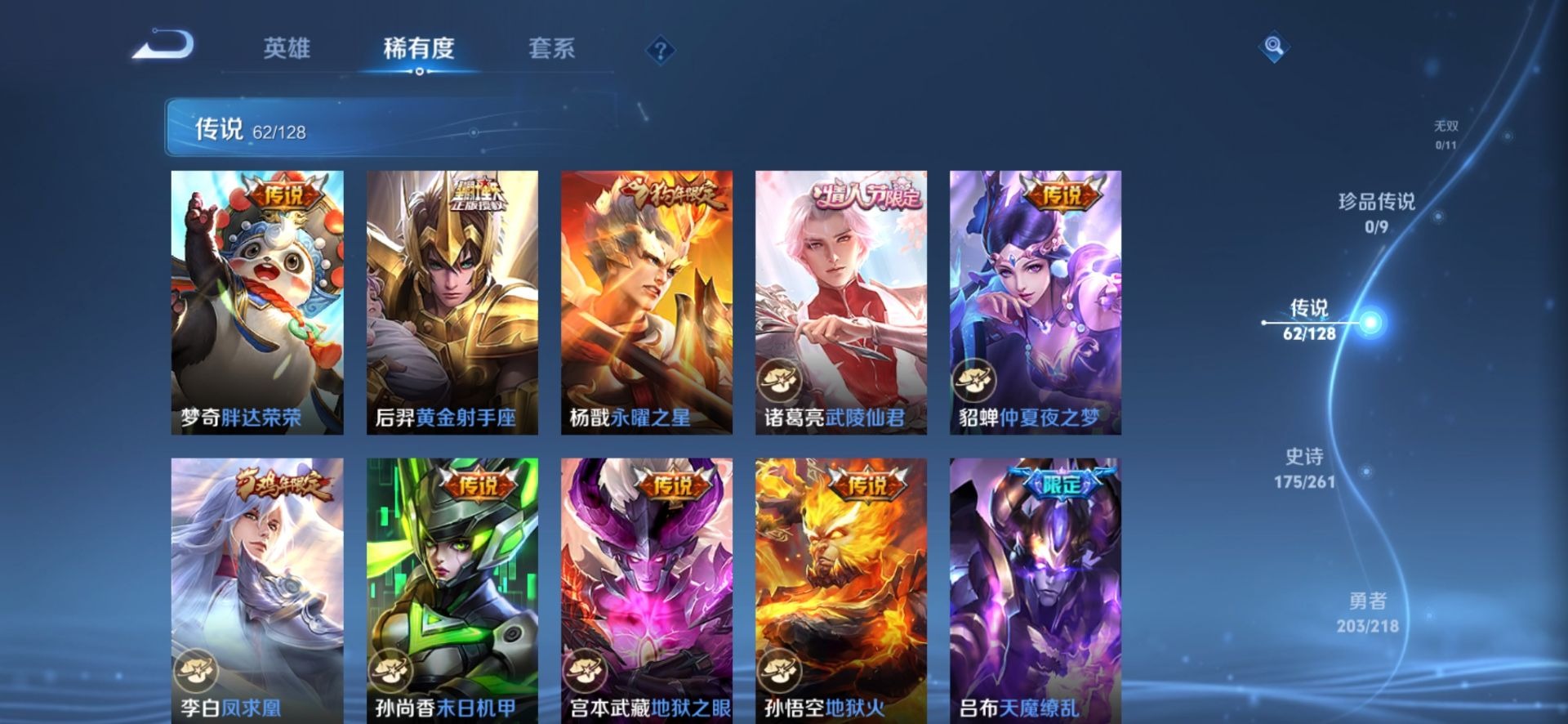 曹操天狼征服者,苏烈玄武志,牛魔奔雷神使,项羽霸王别姬,露娜一生所爱,庄周玄嵩,庄周云端筑梦师,诸葛亮时雨天司,司空震愿照·山河定,裴擒虎梅西,裴擒虎李小龙,裴擒虎天狼狩猎者,东皇太一逐梦之光,上官婉儿梁祝,上官婉儿天狼绘梦者,花木兰默契交锋,花木兰瑞麟志,花木兰青春决赛季,马可波罗逐梦之星,马可波罗山海·玄木吟,猪八戒猪悟能,孙悟空孙行者,孙悟空大圣娶亲,芈月白晶晶,孙悟空至尊宝,孙悟空美猴王,雅典娜神奇女侠,韩信飞衡,韩信逐梦之影,百里守约朱雀志,澜愿照·九州拓,虞姬霸王别姬,虞姬愿照·岁时盈,嫦娥如梦令,王昭君凤凰于飞,哪吒逐梦之翼,甄姬幽恒,铠青龙志,廉颇寅虎·御盾,伽罗太华,赵云龙胆,孙膑天狼运算者,孙膑寅虎·展翼,干将莫邪冰霜恋舞曲,典韦岱宗,吕布御风骁将,后羿如梦令,后羿辉光之辰,兰陵王默契交锋,公孙离祈雪灵祝,公孙离蜜橘之夏,安琪拉魔法小厨娘,桑启鸣野蒿,女娲愿照·千秋盛,百里玄策白虎志,马超神威,赵云引擎之心,妲己愿照·众生和,蔡文姬奇迹圣诞,蔡文姬愿照·福禄聚,瑶山海·碧波行,妲己热情桑巴,关羽武圣,关羽冰锋战神