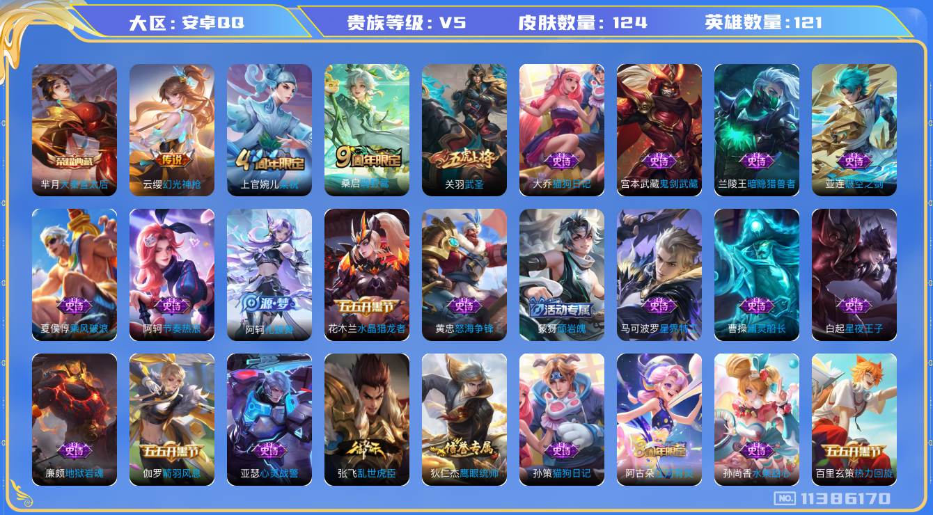 [11386170]V5 1典藏 3传说 121英雄 124皮肤 可修改实名 优质装备:大秦宣太后 传说皮:幻光神枪 珍宝阁皮:优雅恋人 限定皮:鸣野蒿,武圣,梁祝 史诗皮:化蝶舞,怒海争锋,破空之剑,蒙犽顽岩魄,埋骨钱,星界特工,黄金分割率,特工魅影,江河有灵,电玩·爆裂旋风,猫狗日记-孙策,猫狗日记-大乔,乱世虎臣,节奏热浪,修罗,水果甜心,星夜王子,暗隐猎兽者,幽灵船长,鬼剑武藏,暗渊魔法,心灵战警,地狱岩魂,乘风破浪,逐浪之夏,水晶猎龙者,热力回旋,箭羽风息,金属风暴,原初追逐者,圣诞狂欢,鹰眼统帅,魅力维加斯