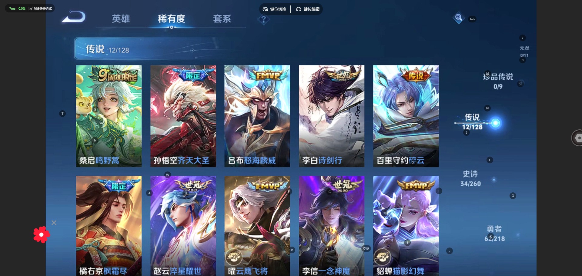 - PX_2106456-Q/永恒钻石/254皮肤/124英雄/1典藏/0珍品无双/2无双/3珍品传说/28传说/75史诗/8稀有英雄 【3 珍品传说】怪盗基德 马可波罗,时之奇旅 孙策,江户川柯南 鲁班七号, 【1 典藏皮肤】拾光映像 瑶, 【2 无双皮肤】时之魔女 小乔,青丘·九尾 妲己, 【28 传说皮肤】启明星使 虞姬,花朝如约 蔡文姬,碎云 百里守约,逐花归海 澜,无双飞将 马超,白虎志 百