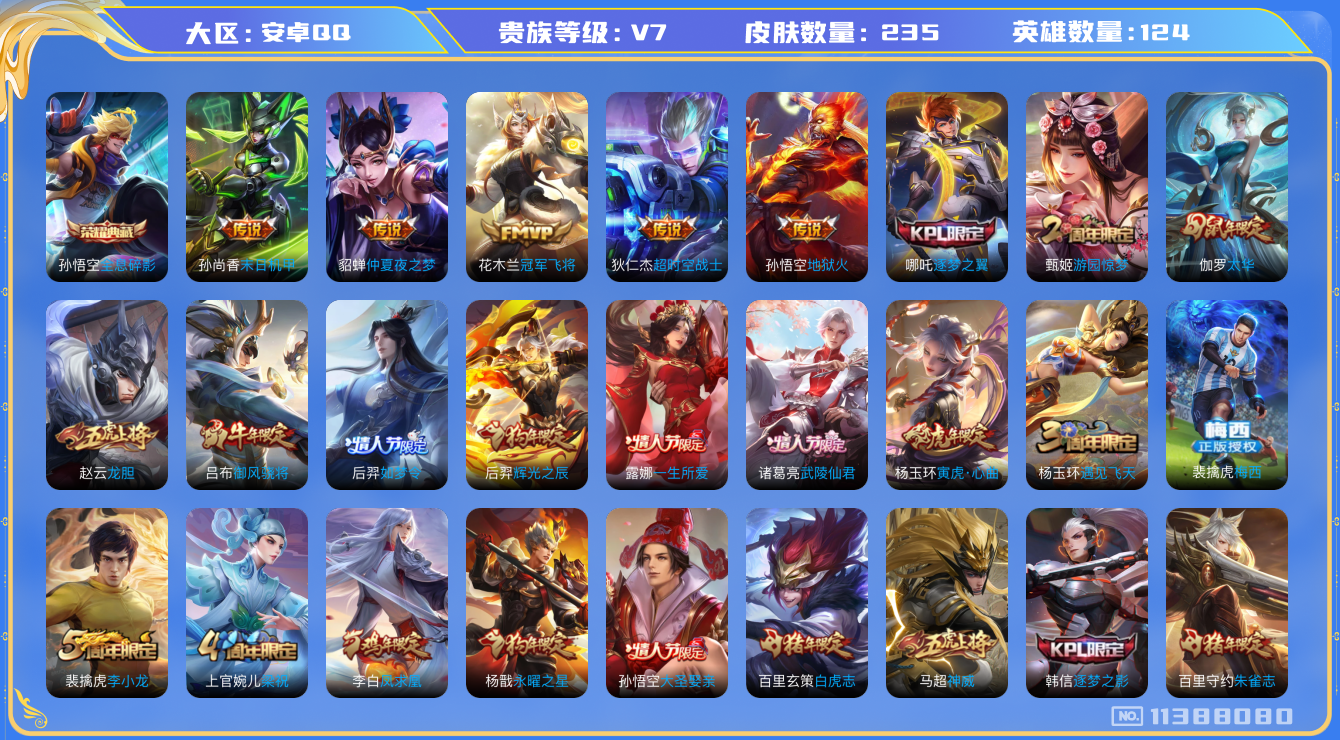 [11388080]V7 1典藏 10传说 124英雄 235皮肤 可修改实名 优质装备:全息碎影(猴子典藏),冠军飞将,末日机甲-孙尚香(绿蚂蚱),地狱火,仲夏夜之梦(大飞蛾),超时空战士-狄仁杰 珍宝阁皮:优雅恋人 限定皮:白虎志(电光耗子),凤求凰(白切鸡),太华(伽罗年限),梅西,武陵仙君(小桃花),神威(电光马子),遇见飞天,游园惊梦,梁祝,御风骁将(吕布年限),龙胆,逐梦之翼,李小龙,逐梦之影,朱雀志(守约年限),永曜之星,辉光之辰,如梦令-嫦娥,如梦令-后羿,一生所爱,大圣娶亲,寅虎·心曲(虎婆) 史诗皮:化蝶舞,龙之律动,藏狐·褐绒,茶境仙,紫霞仙子,苍穹之光,电玩小子(小书包),黄金分割率,特工魅影,千年之狐,江河有灵,蒙恬荣光圣徽,无限星赏官,电玩·爆裂旋风,乱世虎臣,摇滚巨星,水果甜心,星夜王子,德古拉伯爵,暗隐猎兽者,鬼剑武藏,乐园奇幻夜,舞动绿茵,地狱岩魂,纤云弄巧,繁星吟游(呼啦呼啦),拒霜思,乘风破浪,逐浪之夏,水晶猎龙者,曙光守护者,金属风暴,原初追逐者,圣诞狂欢,圣诞恋歌,鹰眼统帅,暗夜贵公子,魅力维加斯,黎明之约,无心,未来纪元-赵云