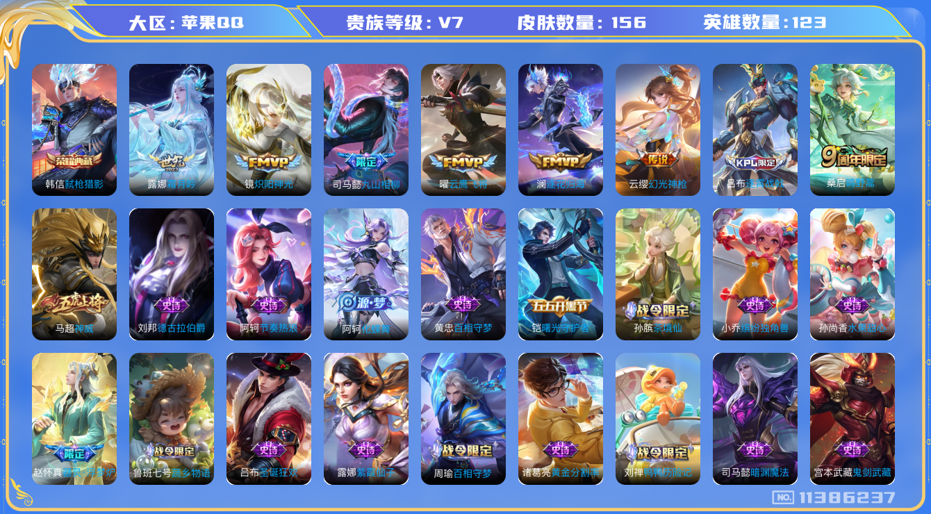 [11386237]V7 1典藏 7传说 123英雄 156皮肤 可修改实名 女号 优质装备:弑枪猎影(韩信典藏),云鹰飞将(小将军),炽阳神光,霜月吟,澜逐花归海 传说皮:九山相柳,幻光神枪 珍宝阁皮:万物之道 限定皮:逐霄战戟,鸣野蒿,神威(电光马子) 史诗皮:鸭鸭历险记-刘禅,器灵·浮梦炉,化蝶舞,龙之律动,百相守梦-周瑜,茶境仙,破空之剑,蒙犽顽岩魄,蔬乡物语(鲁班七号),百相守梦-百里守约,百相守梦-黄忠,织梦人,紫霞仙子,黄金分割率,晚萤,节奏热浪,修罗,水果甜心,德古拉伯爵,暗隐猎兽者,鬼剑武藏,暗渊魔法,心灵战警,缤纷独角兽,水晶猎龙者,曙光守护者,热力回旋,金属风暴,圣诞狂欢,圣诞恋歌,鹰眼统帅,魅力维加斯