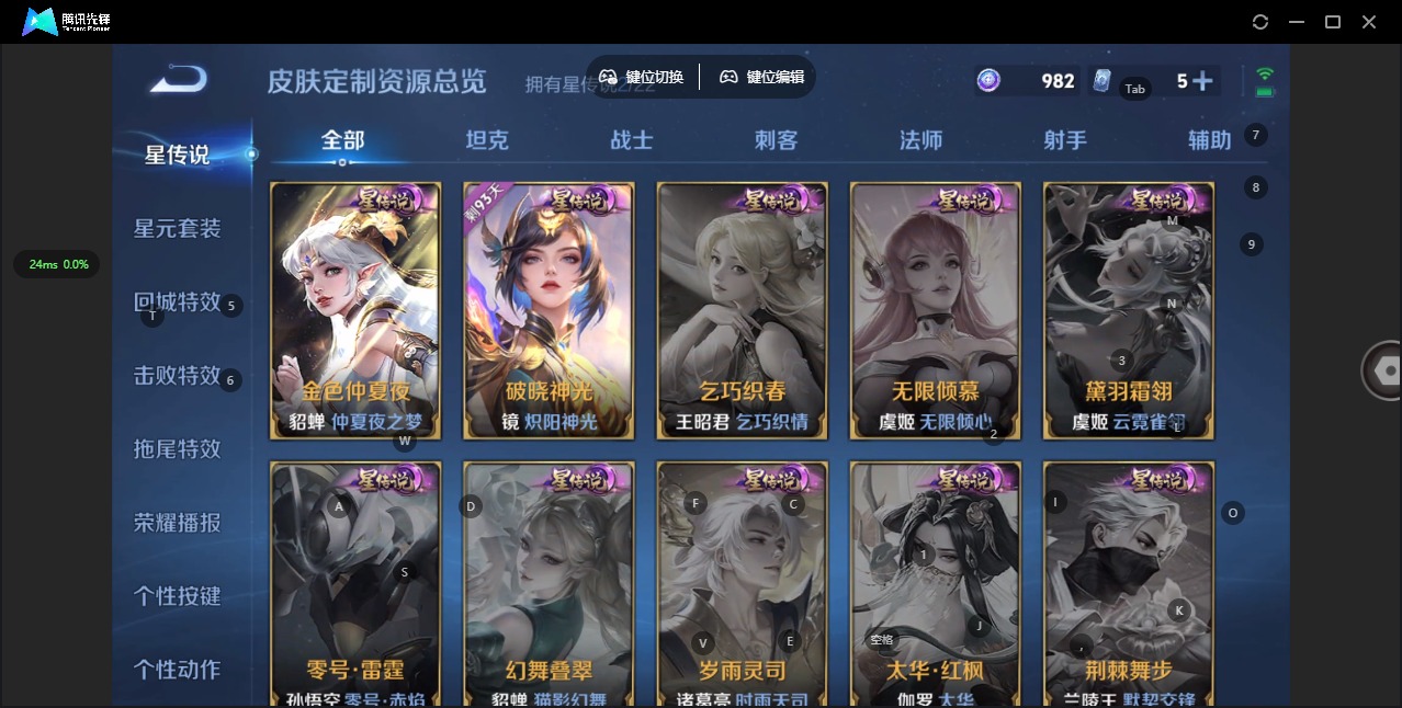 大乔猫狗日记,刘邦德古拉伯爵,夏侯惇乘风破浪,阿轲节奏热浪,铠曙光守护者,曹操幽灵船长,廉颇地狱岩魂,伽罗箭羽风息,小乔缤纷独角兽,孙策猫狗日记,不知火舞魅语,赵怀真器灵·浮梦炉,鲁班七号电玩小子,项羽苍穹之光,吕布圣诞狂欢,露娜紫霞仙子,吕布末日机甲,诸葛亮黄金分割率,刘禅电玩·爆裂旋风,刘禅天才门将,刘禅绅士熊喵,宫本武藏鬼剑武藏,公孙离无限星赏官,兰陵王暗隐猎兽者,貂蝉圣诞恋歌,苍狼魂孤将,花木兰水晶猎龙者,夏洛特永昼,李白千年之狐,安琪拉心灵骇客,蒙犽百解令,西施诗语江南,白起星夜王子,亚瑟心灵战警,张良千筹问战,嬴政摇滚巨星,嬴政暗夜贵公子,程咬金功夫厨神,百里玄策热力回旋,百里玄策原初追逐者,雅典娜冰冠公主,雅典娜黎明之约,韩信白龙吟,李元芳匿光侦查者,李元芳逐浪之夏,百里守约特工魅影,墨子龙骑士,墨子金属风暴,蔡文姬舞动绿茵,澜赏金猎手,娜可露露晚萤,王昭君偶像歌手,嫦娥拒霜思,橘右京修罗