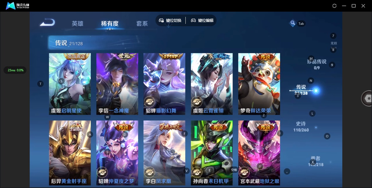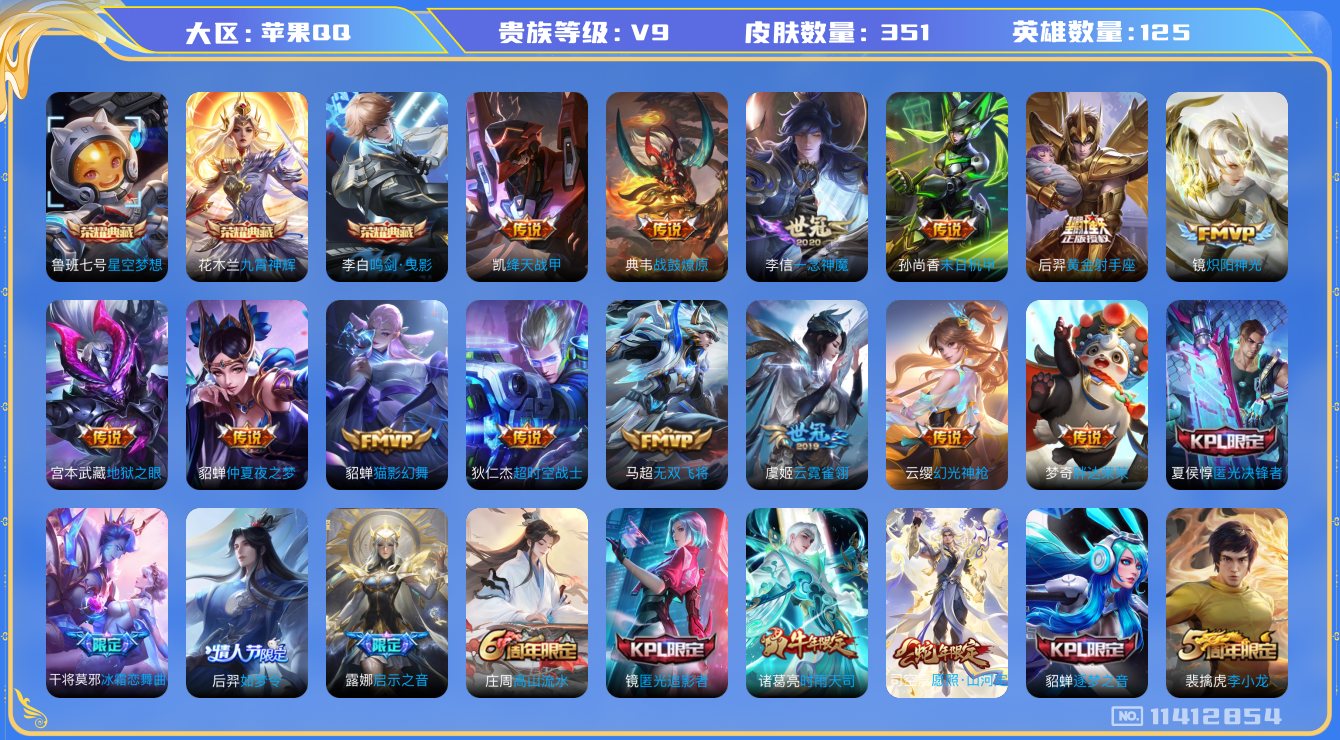 [11412854]V9 3典藏 21传说 125英雄 351皮肤 可修改实名 优质装备:星空梦想(太空人),鸣剑·曳影,九霄神辉(木兰典藏),黄金射手座,绛天战甲(鸡嘴战神),猫影幻舞,炽阳神光,一念神魔,云霓雀翎,末日机甲-孙尚香(绿蚂蚱),仲夏夜之梦(大飞蛾),地狱之眼,胖达荣荣,超时空战士-狄仁杰,无双飞将 传说皮:典韦战鼓燎原,幻光神枪 珍宝阁皮:万物之道,优雅恋人,女武神 限定皮:愿照·九州拓(澜年限),愿照·山河定(司空震年限),愿照·千秋盛(女娲年限),至尊宝,凤求凰(白切鸡),傲雪梅枪,时雨天司(水龙头),神威(电光马子),飞衡(韩信年限),瑞麟志(木兰年限),高山流水,匿光决锋者,五谷丰年,冰锋战神,梁祝,逐梦之音,李小龙,如梦令-后羿,默契交锋-花木兰,青春决赛季,冰霜恋舞曲,匿光追影者,启示之音 史诗皮:赞萌露比,器灵·浮梦炉,狼魂孤将,化蝶舞,灵蛊蚀心,星界战将,龙之律动,石田雨龙,百相守梦-周瑜,戍鼓铭心,幻珠鲛人,百相守梦-黄忠,织梦人,守夜人,紫霞仙子,苍穹之光,电玩小子(小书包),白龙吟,黄金分割率,特工魅影,千年之狐,永昼,匿光侦查者,魅语,百解令(蒙犽),蒙恬荣光圣徽,无限星赏官,冰冠公主,偶像歌手,晚萤,电玩·爆裂旋风,龙骑士(小龙虾),末日机甲-吕布,猫狗日记-孙策,猫狗日记-大乔,乱世虎臣,节奏热浪,修罗,女仆咖啡,摇滚巨星,水果甜心,绅士熊喵,天才门将,星夜王子,心灵骇客,功夫厨神,德古拉伯爵,暗隐猎兽者,幽灵船长,鬼剑武藏,心灵战警,舞动绿茵,地狱岩魂,诗语江南,纤云弄巧,拒霜思,缤纷独角兽,乘风破浪,逐浪之夏,水晶猎龙者,曙光守护者,热力回旋,箭羽风息,金属风暴,原初追逐者,圣诞狂欢,圣诞恋歌,鹰眼统帅,暗夜贵公子,魅力维加斯,黎明之约,赏金猎手,千筹问战,无心,未来纪元-赵云