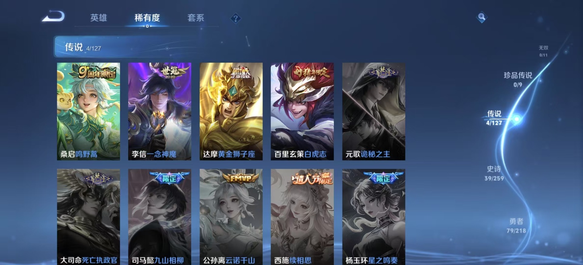 [11352125]V6 4传说 123英雄 159皮肤 可修改实名 优质装备:黄金狮子座,一念神魔 珍宝阁皮:妄想食味,胡桃夹子 限定皮:鸣野蒿,白虎志(电光耗子),飞衡(韩信年限),五谷丰年,青龙志(铠年限),梁祝,御风骁将(吕布年限),李小龙 史诗皮:星界战将,谪仙醉月,龙之律动,百相守梦-黄忠,紫霞仙子,特工魅影,千年之狐,江河有灵,蒙恬荣光圣徽,冰冠公主,偶像歌手,修罗,水果甜心,星夜王子,德古拉伯爵,幽灵船长,鬼剑武藏,舞动绿茵,乘风破浪,逐浪之夏,水晶猎龙者,曙光守护者,原初追逐者,圣诞狂欢,鹰眼统帅,魅力维加斯,黎明之约,未来纪元-赵云