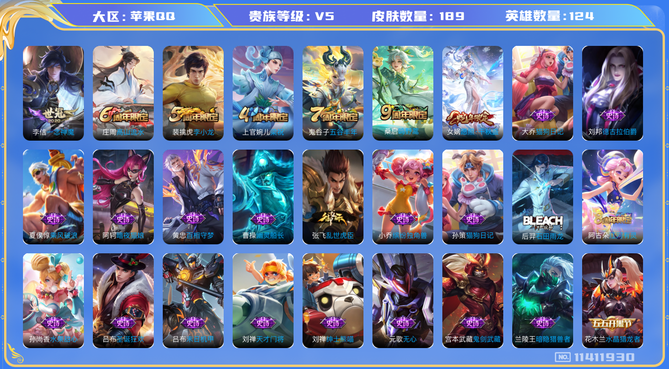 - [11682429]V8 1典藏 19传说 124英雄 269皮肤 可修改实名 优质装备:弑枪猎影(韩信典藏),黄金狮子座,黄金射手座,云鹰飞将(小将军),绛天战甲(鸡嘴战神),一念神魔,末日机甲-孙尚香(绿蚂蚱),时之恋人-刘备(电焊工),淬星耀世,超时空战士-狄仁杰,无双飞将,山海·炽霜斩(李信年限),山海·苍雷引(电光曜子),夜礼服假面 珍宝阁皮:胡桃夹子,玩趣恶龙 限定皮:愿照·九州拓(澜年限),愿照·山河定(司空震年限),逐霄战戟,鸣野蒿,夏侯惇霜北刀,怒海麟威,降魔,五谷丰年,烈魂,李小龙,引擎之心,山海·玄木吟(马可年限) 史诗皮:鸭鸭历险记-刘禅,化蝶舞,星界特工,龙之律动,藏狐·褐绒,百相守梦-周瑜,茶境仙,蒙犽顽岩魄,埋骨钱,百相守梦-百里守约,百相守梦-黄忠,紫霞仙子,特工魅影,千年之狐,永昼,江河有灵,蒙恬荣光圣徽,偶像歌手,暗夜猫娘,魅语,无限星赏官,末日机甲-吕布,猫狗日记-大乔,乱世虎臣,修罗,女仆咖啡,摇滚巨星,水果甜心,绅士熊喵,暗隐猎兽者,鬼剑武藏,暗渊魔法,心灵战警,舞动绿茵,纤云弄巧,缤纷独角兽,乘风破浪,逐浪之夏,龙鼓争鸣,水晶猎龙者,曙光守护者,热力回旋,箭羽风息,金属风暴,原初追逐者,圣诞恋歌,鹰眼统帅,魅力维加斯,赏金猎手,无心,未来纪元-赵云