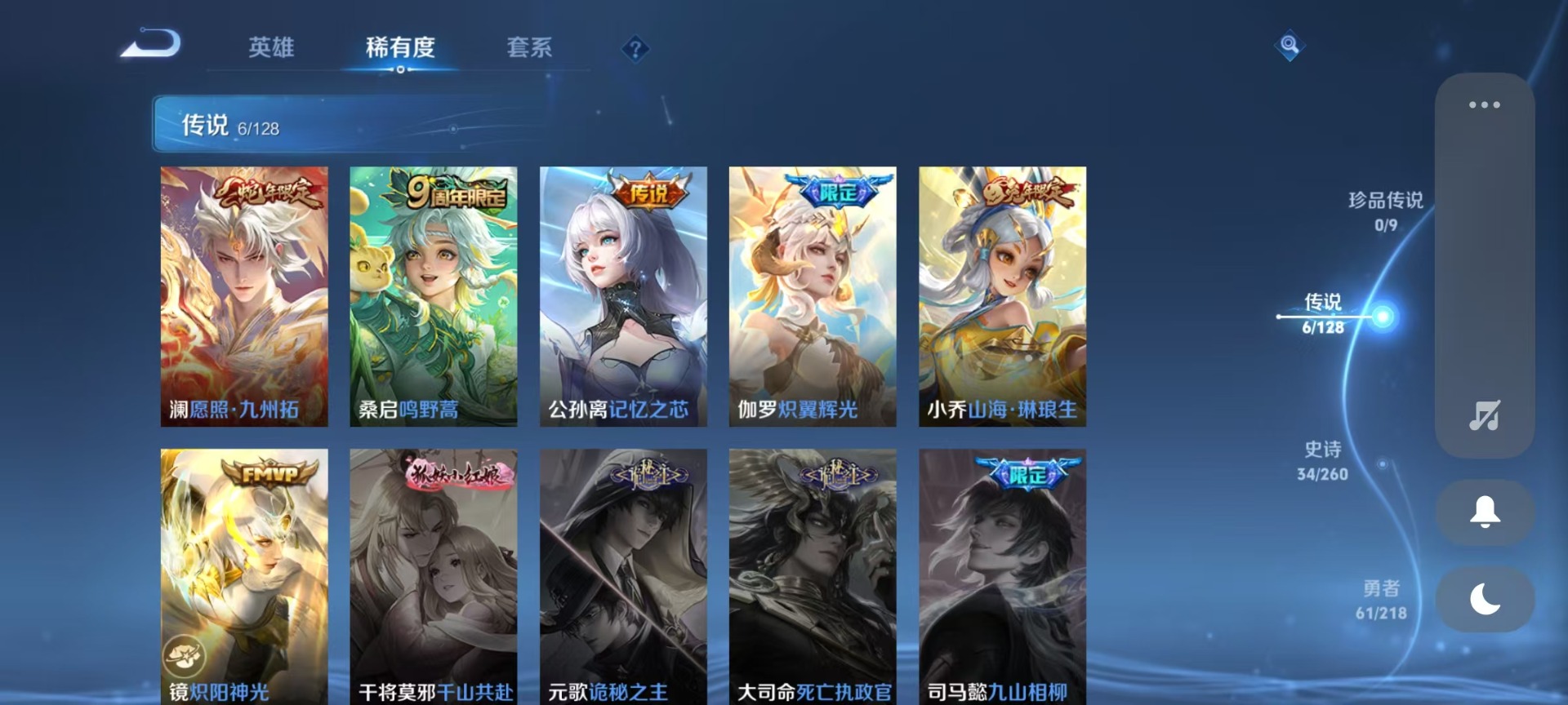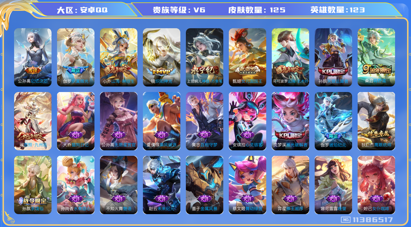 [11386517]V6 6传说 123英雄 125皮肤 可修改实名 优质装备:炽阳神光,山海·琳琅生(小乔年限),炽翼辉光(娃娃菜牛角包),记忆之芯(机甲兔) 珍宝阁皮:蔷薇恋人 限定皮:愿照·九州拓(澜年限),鸣野蒿,天狼运算者,女儿国国王,神器·万象笔,山海·玄木吟(马可年限) 史诗皮:茶境仙,琥珀纪元伽罗,百相守梦-黄忠,黄金分割率,魅语,蒙恬荣光圣徽,无限星赏官,匿光破解者,偶像歌手,晚萤,猫狗日记-大乔,女仆咖啡,水果甜心,绅士熊喵,心灵骇客,舞动绿茵,乘风破浪,金属风暴,鹰眼统帅,魅力维加斯,滕王阁序,未来纪元-赵云