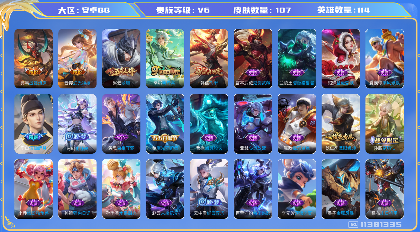 [11381335]V6 3传说 114英雄 107皮肤 可修改实名 传说皮:典韦战鼓燎原,幻光神枪 珍宝阁皮:蔷薇恋人 限定皮:鸣野蒿,飞衡(韩信年限),龙胆 史诗皮:化蝶舞,谪仙醉月,龙之律动,茶境仙,百相守梦-黄忠,特工魅影,偶像歌手,末日机甲-吕布,猫狗日记-孙策,女仆咖啡,摇滚巨星,水果甜心,天才门将,暗隐猎兽者,幽灵船长,鬼剑武藏,心灵战警,纤云弄巧,缤纷独角兽,乘风破浪,逐浪之夏,曙光守护者,金属风暴,圣诞恋歌,鹰眼统帅,魅力维加斯,未来纪元-赵云