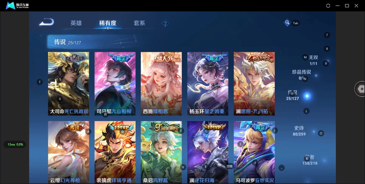 - [12286465]V8 1典藏 2珍品传说 25传说 125英雄 224皮肤 可修改实名 优质装备:神鉴启示录,酷洛米之心,黄金狮子座,云鹰飞将(小将军),绛天战甲(鸡嘴战神),久胜战神,炽阳神光,一念神魔,云霓雀翎,末日机甲-孙尚香(绿蚂蚱),地狱火,海洋之心,地狱之眼,飞鸢探春,胖达荣荣,乞巧织情,游龙清影(小青龙),花朝如约(花篮子),无双飞将,音你闪耀(rap皮),山海·炽霜斩(李信年限),鹤羽星尊 珍品传说:时之奇旅-孙策 传说皮:幻光神枪 珍宝阁皮:胡桃夹子,优雅恋人,蔷薇恋人 限定皮:逐霄战戟,鸣野蒿,神威(电光马子),高山流水,齐天大圣,怒海麟威,五谷丰年,冰锋战神,游园惊梦,梁祝,李小龙,逐梦之影,猪悟能,引擎之心 史诗皮:化蝶舞,龙之律动,芈月浮光幕影,紫霞仙子,黄金分割率,特工魅影,千年之狐,江河有灵,龙骑士(小龙虾),末日机甲-吕布,猫狗日记-孙策,乱世虎臣,节奏热浪,修罗,摇滚巨星,水果甜心,星夜王子,心灵骇客,功夫厨神,德古拉伯爵,暗隐猎兽者,幽灵船长,鬼剑武藏,心灵战警,舞动绿茵,地狱岩魂,纤云弄巧,繁星吟游(呼啦呼啦),拒霜思,缤纷独角兽,乘风破浪,逐浪之夏,水晶猎龙者,曙光守护者,箭羽风息,金属风暴,圣诞恋歌,鹰眼统帅,魅力维加斯,无心