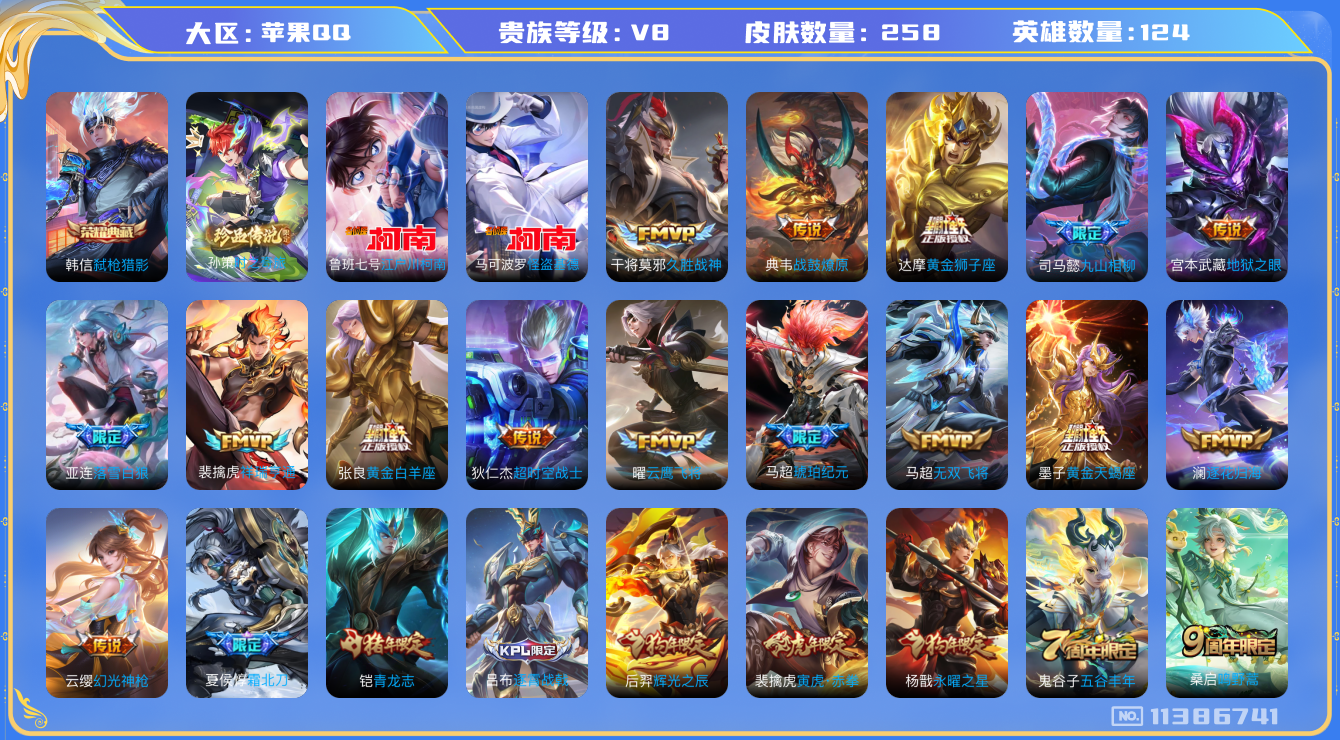 [11386741]V8 1典藏 3珍品传说 23传说 124英雄 256皮肤 可修改实名 优质装备:弑枪猎影(韩信典藏),江户川柯南,怪盗基德,黄金狮子座,云鹰飞将(小将军),黄金白羊座,久胜战神,地狱之眼,超时空战士-狄仁杰,无双飞将,澜逐花归海,琥珀纪元马超,黄金天蝎座 珍品传说:时之奇旅-孙策 传说皮:典韦战鼓燎原,落雪白狼,九山相柳,祥瑞亨通,幻光神枪 珍宝阁皮:妄想食味,万物之道 限定皮:愿照·九州拓(澜年限),逐霄战戟,鸣野蒿,夏侯惇霜北刀,至尊宝,傲雪梅枪,神威(电光马子),齐天大圣,五谷丰年,青龙志(铠年限),冰锋战神,武圣,永曜之星,辉光之辰,引擎之心,美猴王,寅虎·赤拳(老虎年限) 史诗皮:鸭鸭历险记-刘禅,器灵·浮梦炉,狼魂孤将,星界战将,龙之律动,百相守梦-周瑜,茶境仙,怒海争锋,撼地雄心,破空之剑,战舞者,蔬乡物语(鲁班七号),百相守梦-百里守约,百相守梦-黄忠,遇见神鹿,紫霞仙子,黄金分割率,特工魅影,千年之狐,百解令(蒙犽),高渐离燃音魔法,蒙恬荣光圣徽,青蛇,百相守梦(关羽),龙骑士(小龙虾),末日机甲-吕布,节奏热浪,修罗,女仆咖啡,水果甜心,星夜王子,心灵骇客,功夫厨神,德古拉伯爵,暗隐猎兽者,幽灵船长,鬼剑武藏,暗渊魔法,心灵战警,乐园奇幻夜,天秀·启明,舞动绿茵,地狱岩魂,纤云弄巧,拒霜思,缤纷独角兽,乘风破浪,逐浪之夏,月团寄思,水晶猎龙者,曙光守护者,箭羽风息,唤灵魅影,金属风暴,原初追逐者,圣诞狂欢,鹰眼统帅,魅力维加斯,赏金猎手,无心,未来纪元-赵云