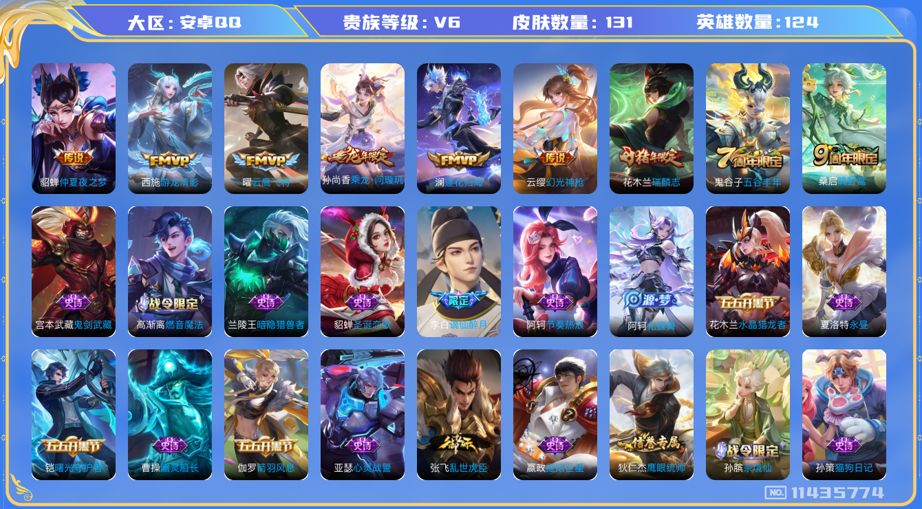 [11435774]V6 7传说 124英雄 131皮肤 可修改实名 优质装备:云鹰飞将(小将军),仲夏夜之梦(大飞蛾),游龙清影(小青龙),澜逐花归海 传说皮:乘龙·问璇玑(孙尚香年限),幻光神枪 珍宝阁皮:妄想食味 限定皮:鸣野蒿,瑞麟志(木兰年限),五谷丰年 史诗皮:化蝶舞,星界战将,谪仙醉月,茶境仙,紫霞仙子,电玩小子(小书包),特工魅影,永昼,高渐离燃音魔法,蒙恬荣光圣徽,晚萤,猫狗日记-孙策,乱世虎臣,节奏热浪,摇滚巨星,水果甜心,暗隐猎兽者,幽灵船长,鬼剑武藏,心灵战警,纤云弄巧,水晶猎龙者,曙光守护者,箭羽风息,圣诞狂欢,圣诞恋歌,鹰眼统帅,魅力维加斯,黎明之约