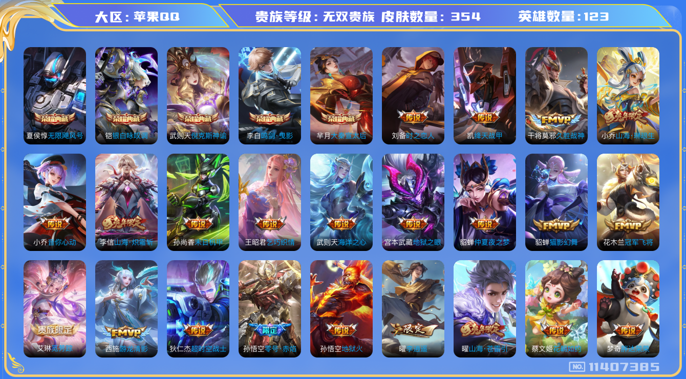 [11407385]无双贵族 5典藏 36传说 123英雄 354皮肤 典藏英雄武则天 可修改实名 优质装备:倪克斯神谕(宇宙婆娘),无限飓风号(高达),大秦宣太后,鸣剑·曳影,银白咏叹调(倪克斯侍卫),冠军飞将,绛天战甲(鸡嘴战神),猫影幻舞,久胜战神,末日机甲-孙尚香(绿蚂蚱),地狱火,仲夏夜之梦(大飞蛾),音你心动-小乔,零号·赤焰,海洋之心,地狱之眼,胖达荣荣,李逍遥,乞巧织情,时之恋人-刘备(电焊工),游龙清影(小青龙),超时空战士-狄仁杰,花朝如约(花篮子),山海·炽霜斩(李信年限),山海·琳琅生(小乔年限),山海·苍雷引(电光曜子),艾琳觅芳踪 珍宝阁皮:优雅恋人,玩趣恶龙 限定皮:至尊宝,太华(伽罗年限),异界灵契(白毛香),傲雪梅枪,补天,寅虎·展翼(孙膑年限),白鹤梁神女,白晶晶,时雨天司(水龙头),神威(电光马子),玄嵩(庄周年限),山海·碧波行(瑶年限),遇见飞天,高山流水,齐天大圣,匿光决锋者,五谷丰年,武圣,天狼运算者,游园惊梦,御风骁将(吕布年限),天狼溯光者,奔雷神使(牛魔年限),祈雪灵祝(雪兔子),天狼绘梦者,李小龙,逐梦之影,如梦令-嫦娥,如梦令-后羿,霸王别姬-项羽,霸王别姬-虞姬,孙行者,猪悟能,一生所爱,天魔缭乱,青春决赛季,乒乒小将,蜜橘之夏,神奇女侠,匿光追影者,女儿国国王,寅虎·御盾(廉颇年限),寅虎·瑞焰(虎皮蛋子),寅虎·心曲(虎婆),寅虎·赤拳(老虎年限),时之祈愿-云中君,时之祈愿-瑶(瑶传限),百木心枪,玉兔公主,启示之音,无尽星芒,山海·玄木吟(马可年限) 史诗皮:紫霞仙子,苍穹之光,白龙吟,黄金分割率,特工魅影,千年之狐,永昼,江河有灵,魅语,无限星赏官,冰冠公主,偶像歌手,晚萤,暗夜猫娘,龙骑士(小龙虾),末日机甲-吕布,猫狗日记-孙策,时之恋人-孙尚香,乱世虎臣,节奏热浪,修罗,女仆咖啡,摇滚巨星,水果甜心,绅士熊喵,天才门将,星夜王子,心灵骇客,时之奇旅-安琪拉,功夫厨神,德古拉伯爵,暗隐猎兽者,幽灵船长,鬼剑武藏,心灵战警,天秀·启明,舞动绿茵,地狱岩魂,纤云弄巧,繁星吟游(呼啦呼啦),拒霜思,缤纷独角兽,乘风破浪,逐浪之夏,水晶猎龙者,曙光守护者,金属风暴,圣诞狂欢,圣诞恋歌,鹰眼统帅,魅力维加斯,黎明之约,赏金猎手,奇遇舞章,天秀·音浪,寅虎·御盾,千筹问战,无心,未来纪元-赵云