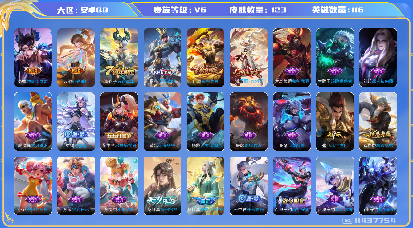 - [11251113]V10 2典藏 1珍品无双 2无双 5珍品传说 60传说 125英雄 531皮肤 可修改实名 优质装备:馥梦繁花,星域神启(倪克斯贼亮),弑枪猎影(韩信典藏),雪境奇遇-甄姬,器灵·螭龙剑,江户川柯南,怪盗基德,器灵·落星盏,酷洛米之心,黄金狮子座,云鹰飞将(小将军),绛天战甲(鸡嘴战神),黄金白羊座,久胜战神,炽阳神光,一念神魔,云霓雀翎,地狱火,仲夏夜之梦(大飞蛾),零号·赤焰,地狱之眼,胖达荣荣,李逍遥,乞巧织情,游龙清影(小青龙),淬星耀世,超时空战士-狄仁杰,挚爱之约,无双飞将,山海·炽霜斩(李信年限),炽翼辉光(娃娃菜牛角包),浮生妄,百相守梦(张飞),霜月吟,澜逐花归海,艾琳觅芳踪,牧神诗旅,玄雷天君,千劫归真 珍品传说:时之奇旅-孙策 传说皮:乘龙·问璇玑(孙尚香年限),典韦战鼓燎原,云诺千山,铠冥王哈迪斯,续相思,星之鸣奏,祥瑞亨通,幻光神枪 珍宝阁皮:妄想食味,优雅恋人,女武神,玩趣恶龙 限定皮:愿照·九州拓(澜年限),愿照·福禄聚(蔡文姬年限),愿照·岁时盈(虞姬年限),愿照·山河定(司空震年限),愿照·众生和(妲己年限),愿照·千秋盛(女娲年限),逐霄战戟,映山客,陌上桑,鸣野蒿,夏侯惇霜北刀,至尊宝,白虎志(电光耗子),凤求凰(白切鸡),太华(伽罗年限),异界灵契(白毛香),白鹤梁神女,白晶晶,时雨天司(水龙头),飞衡(韩信年限),遇见飞天,高山流水,诗剑行,齐天大圣,匿光决锋者,五谷丰年,青龙志(铠年限),冰锋战神,武圣,天狼运算者,游园惊梦,梁祝,御风骁将(吕布年限),天狼狩猎者,烈魂,天狼溯光者,奔雷神使(牛魔年限),祈雪灵祝(雪兔子),李小龙,如梦令-后羿,霸王别姬-虞姬,圣诞老人,默契交锋-兰陵王,默契交锋-花木兰,猪悟能,一生所爱,引擎之心,神奇女侠,寅虎·赤拳(老虎年限),启示之音,梦圆繁星,山海·玄木吟(马可年限),冰霜神祇 史诗皮:鸭鸭历险记-刘禅,飞车小橘子,苍鳞隐世,器灵·浮梦炉,糖绘人间,狼魂孤将,绮世丹青,瑰影绮梦,化蝶舞,星界特工,星界战将,灵蛊蚀心,龙之律动,雪豹·霜爪,藏狐·褐绒,石田雨龙,百相守梦-周瑜,戍鼓铭心,茶境仙,海诺心动手记,破空之剑,战舞者,涂山红红,东方月初,蒙犽顽岩魄,埋骨钱,芈月浮光幕影,怒海争锋,谪仙醉月,上官婉儿群星魔术团,蔬乡物语(鲁班七号),百相守梦-百里守约,炽弈燎原,百相守