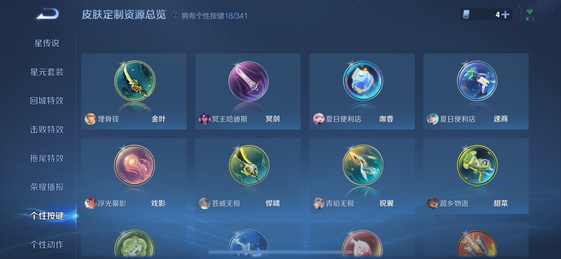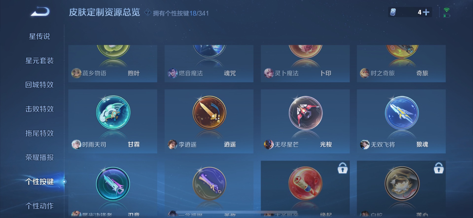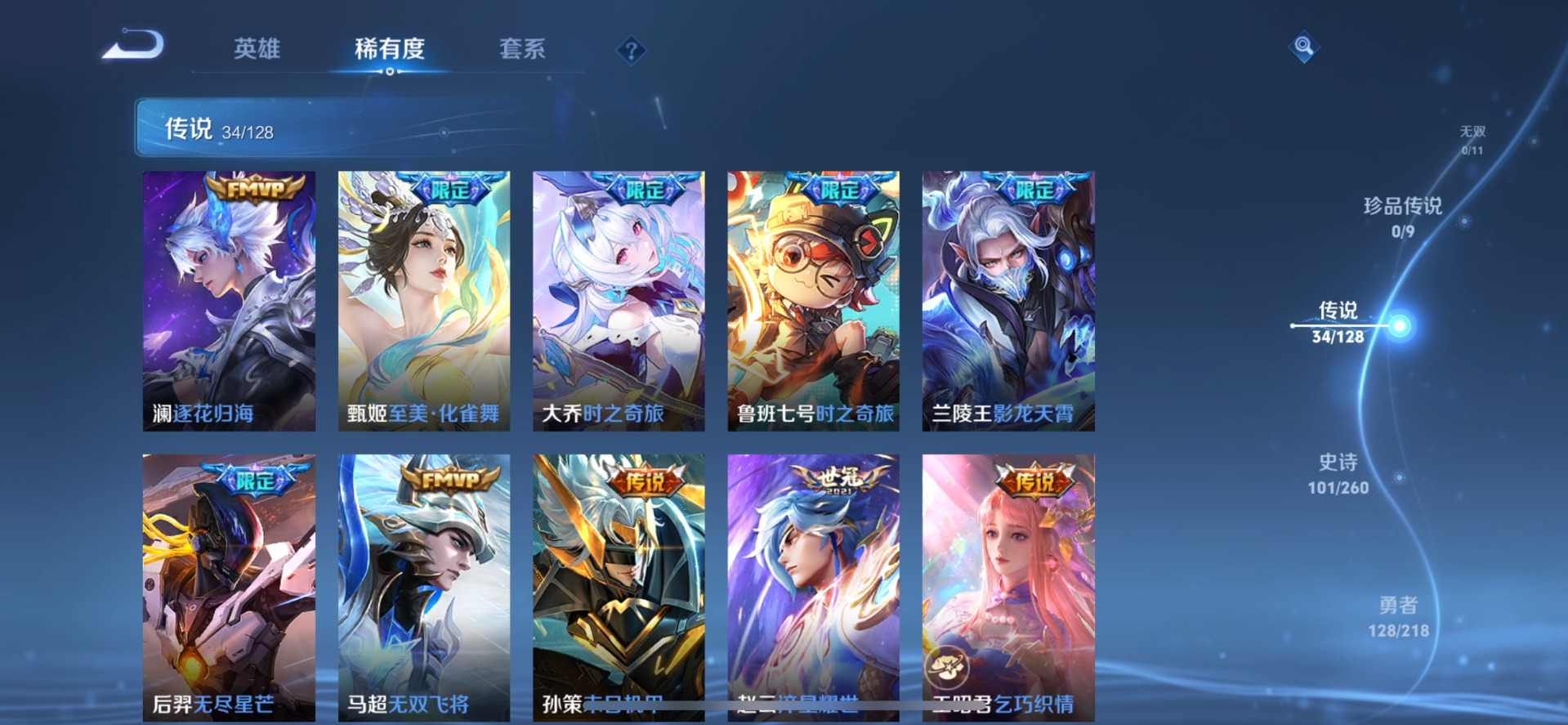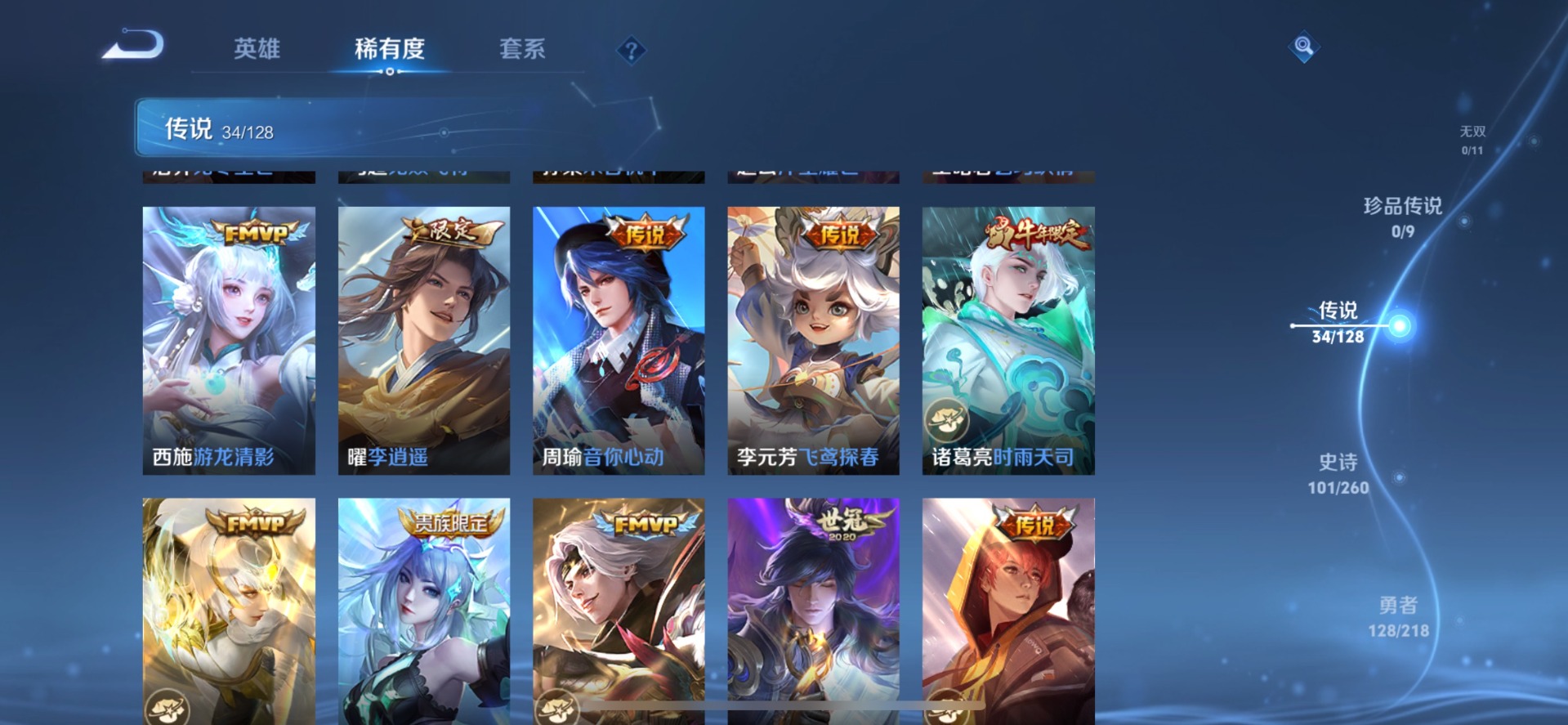 夏侯惇匿光决锋者,甄姬至美·化雀舞,后羿无尽星芒,后羿辉光之辰,诸葛亮时雨天司,公孙离玉兔公主,兰陵王影龙天霄,马可波罗山海·玄木吟,西施至美·乘鲤谣,孙悟空孙行者,孙悟空大圣娶亲,芈月白晶晶,韩信傲雪梅枪