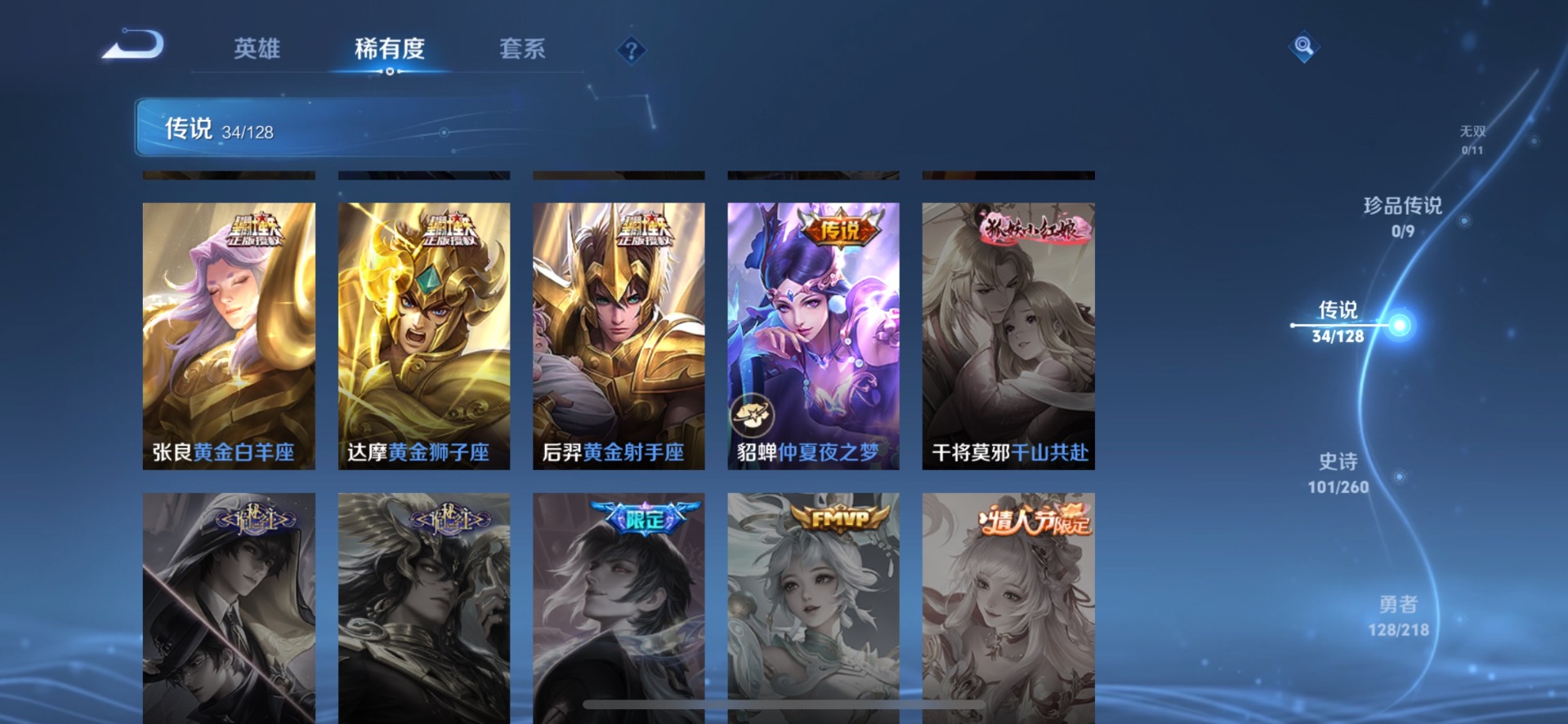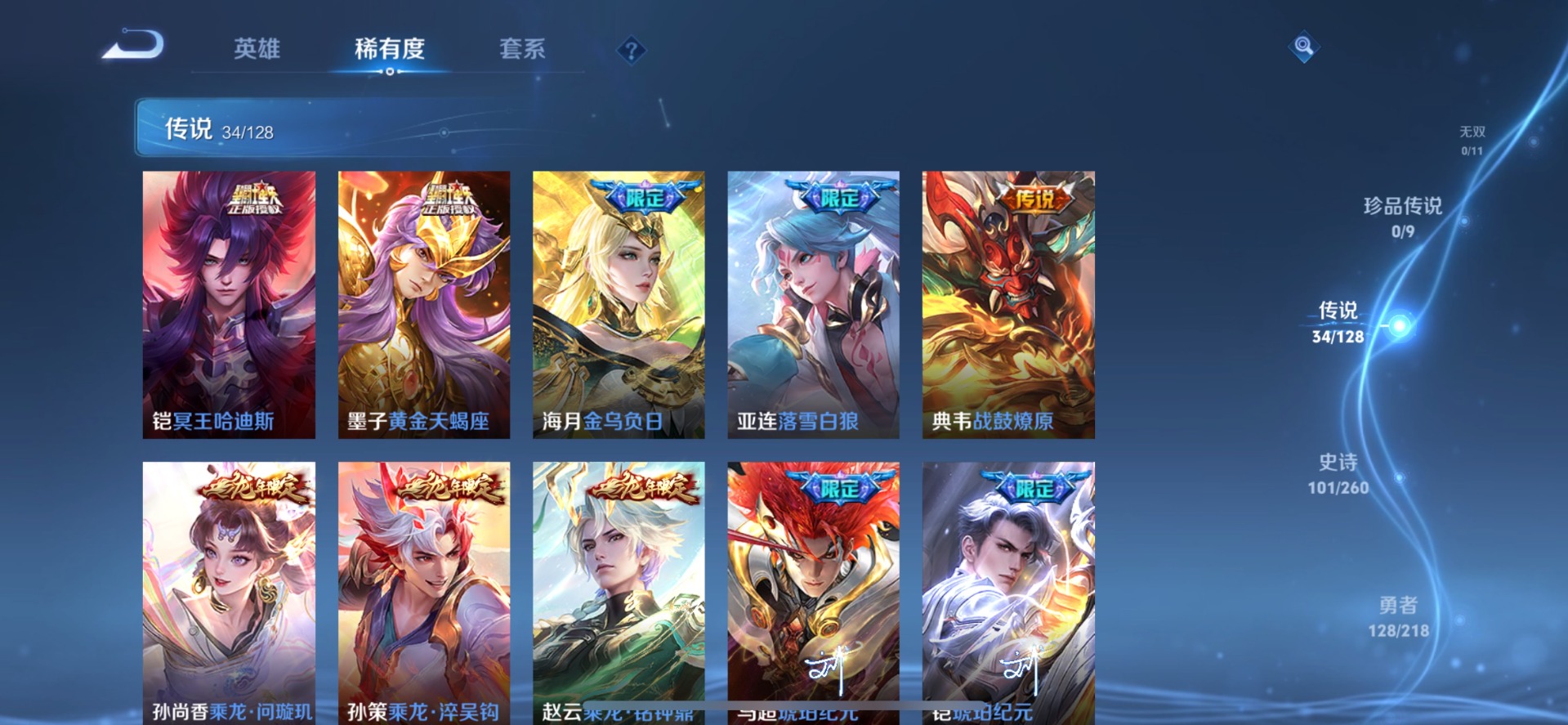 大乔时之奇旅,刘备时之恋人,铠冥王哈迪斯,铠琥珀纪元,赵云乘龙·铭钟鼎,赵云淬星耀世,典韦战鼓燎原,李信一念神魔,孙策末日机甲,孙策乘龙·淬吴钩,达摩黄金狮子座,孙尚香乘龙·问璇玑,海月金乌负日,王昭君乞巧织情,鲁班七号时之奇旅,镜炽阳神光,周瑜音你心动,亚连落雪白狼,西施游龙清影,张良黄金白羊座,曜云鹰飞将,曜李逍遥,马超琥珀纪元,马超无双飞将,李元芳飞鸢探春,墨子黄金天蝎座,澜逐花归海