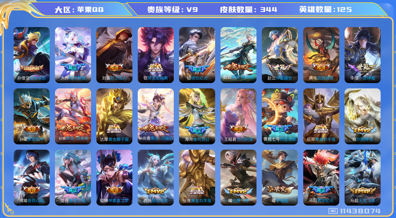 [11438074]V9 1典藏 34传说 125英雄 344皮肤 可修改实名 优质装备:全息碎影(猴子典藏),黄金狮子座,黄金射手座,云鹰飞将(小将军),黄金白羊座,炽阳神光,一念神魔,仲夏夜之梦(大飞蛾),飞鸢探春,音你心动-周瑜,李逍遥,乞巧织情,时之恋人-刘备(电焊工),游龙清影(小青龙),淬星耀世,末日机甲-孙策,无双飞将,鲁班七号-时之奇旅,大乔-时之奇旅,澜逐花归海,琥珀纪元铠,琥珀纪元马超,金乌负日,黄金天蝎座 传说皮:乘龙·问璇玑(孙尚香年限),乘龙·铭钟鼎(赵云年限),乘龙·淬吴钩(孙策年限),典韦战鼓燎原,落雪白狼,铠冥王哈迪斯 珍宝阁皮:胡桃夹子,蔷薇恋人 限定皮:傲雪梅枪,白晶晶,时雨天司(水龙头),至美·乘鲤谣,至美·化雀舞,影龙天霄,遇见飞天,匿光决锋者,五谷丰年,辉光之辰,孙行者,大圣娶亲,玉兔公主,无尽星芒,山海·玄木吟(马可年限) 史诗皮:化蝶舞,灵蛊蚀心,怒海争锋,埋骨钱,芈月浮光幕影,琥珀纪元伽罗,决胜骁骑,上官婉儿群星魔术团,奇遇星旅,蔬乡物语(鲁班七号),曹操夜都魔契,超元猎域,乘龙·聚宝船(安琪拉年限),乘龙·忆丹青(大乔年限),百相守梦-黄忠,遇见神鹿,紫霞仙子,黄金分割率,特工魅影,千年之狐,永昼,江河有灵,匿光侦查者,鹤归松栖(赵怀真),真我赫兹(百里守约),魅语,百解令(蒙犽),高渐离燃音魔法,无限星赏官,青蛇,偶像歌手,晚萤,电玩·爆裂旋风,龙骑士(小龙虾),末日机甲-吕布,猫狗日记-孙策,猫狗日记-大乔,时之恋人-孙尚香,乱世虎臣,修罗,女仆咖啡,摇滚巨星,水果甜心,绅士熊喵,天才门将,星夜王子,心灵骇客,功夫厨神,德古拉伯爵,暗隐猎兽者,幽灵船长,鬼剑武藏,暗渊魔法,心灵战警,乐园奇幻夜,舞动绿茵,纤云弄巧,拒霜思,缤纷独角兽,乘风破浪,逐浪之夏,水晶猎龙者,曙光守护者,箭羽风息,金属风暴,圣诞狂欢,圣诞恋歌,鹰眼统帅,暗夜贵公子,魅力维加斯,赏金猎手,奇遇舞章,天秀·音浪,千筹问战,顽趣-阿古朵,无心,未来纪元-赵云