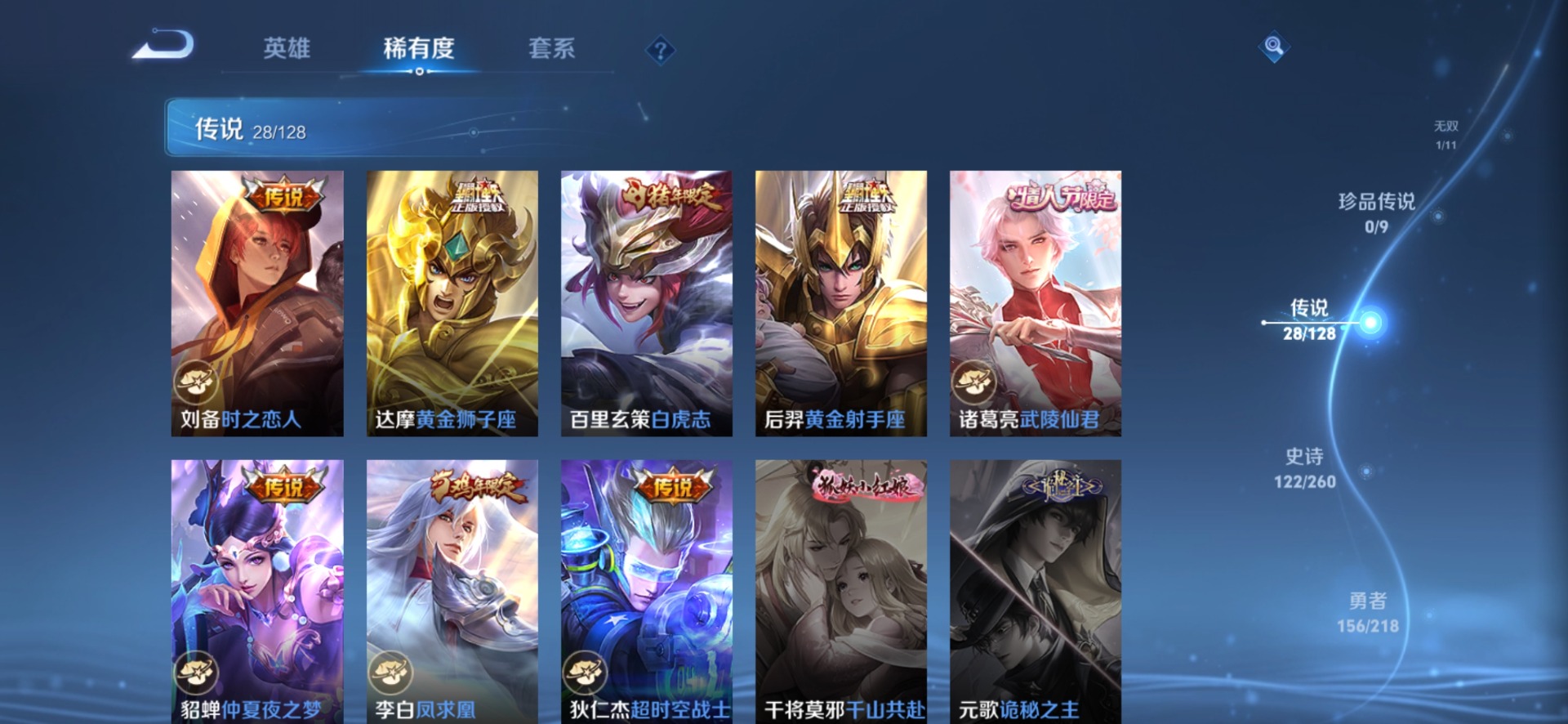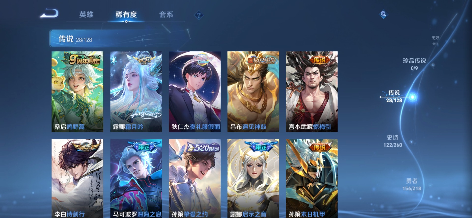 大乔白鹤梁神女,甄姬幽恒,廉颇寅虎·御盾,伽罗天狼溯光者,赵云百木心枪,干将莫邪冰霜恋舞曲,孙尚香异界灵契,后羿如梦令,露娜启示之音,后羿辉光之辰,露娜一生所爱,周瑜真爱至上,诸葛亮时雨天司,杨玉环寅虎·心曲,公孙离玉兔公主,公孙离蜜橘之夏,裴擒虎李小龙,裴擒虎寅虎·赤拳,上官婉儿梁祝,李白诗剑行,花木兰默契交锋,马可波罗逐梦之星,马可波罗深海之息,桑启鸣野蒿,猪八戒猪悟能,孙悟空孙行者,孙悟空大圣娶亲,孙悟空至尊宝,孙悟空美猴王,百里玄策白虎志,马超神威,韩信傲雪梅枪,韩信飞衡,韩信逐梦之影,百里守约朱雀志,嫦娥如梦令,关羽武圣,关羽冰锋战神