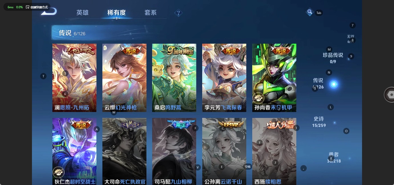 - [11942344]V10 6典藏 40传说 125英雄 376皮肤 可修改实名 优质装备:鸣剑·曳影,全息碎影(猴子典藏),星域神启(倪克斯贼亮),九霄神辉(木兰典藏),赤影疾锋,弑枪猎影(韩信典藏),黄金射手座,冠军飞将,云鹰飞将(小将军),绛天战甲(鸡嘴战神),猫影幻舞,久胜战神,炽阳神光,一念神魔,云霓雀翎,末日机甲-孙尚香(绿蚂蚱),地狱火,仲夏夜之梦(大飞蛾),音你心动-小乔,地狱之眼,音你心动-周瑜,乞巧织情,淬星耀世,超时空战士-狄仁杰,无双飞将,音你闪耀(rap皮),碎云,天秀幻梦,神器·狴犴令,记忆之芯(机甲兔),灼幽烈阳,惊梅引,遇见神鼓,霜月吟,艾琳觅芳踪,涂山容容 传说皮:乘龙·淬吴钩(孙策年限),典韦战鼓燎原 珍宝阁皮:妄想食味 限定皮:鸣野蒿,傲雪梅枪,白晶晶,瑞麟志(木兰年限),至美·乘鲤谣,影龙天霄,遇见飞天,诗剑行,怒海麟威,降魔,五谷丰年,武圣,天狼狩猎者,烈魂,岱宗(典韦年限),朱雀志(守约年限),孙行者,大圣娶亲,天魔缭乱,无尽星芒,深海之息(深海大菠萝),枫霜尽,匿光启智者,时之奇旅-妲己,梦圆繁星 史诗皮:鸭鸭历险记-刘禅,化蝶舞,灵蛊蚀心,龙之律动,小牛鸭,石田雨龙,怒海争锋,琥珀纪元伽罗,决胜骁骑,蔬乡物语(鲁班七号),超元猎域,百相守梦-百里守约,百相守梦-黄忠,遇见神鹿,紫霞仙子,苍穹之光,电玩小子(小书包),白龙吟,黄金分割率,特工魅影,千年之狐,永昼,江河有灵,匿光侦查者,真我赫兹(镜),真我赫兹(百里守约),完美假期,闲日渔趣,魅语,百解令(蒙犽),高渐离燃音魔法,无限星赏官,冰冠公主,青蛇,偶像歌手,白蛇,晚萤,暗夜猫娘,龙骑士(小龙虾),末日机甲-吕布,猫狗日记-孙策,猫狗日记-大乔,时之恋人-孙尚香,乱世虎臣,节奏热浪,修罗,女仆咖啡,摇滚巨星,水果甜心,绅士熊喵,天才门将,星夜王子,心灵骇客,时之奇旅-安琪拉,功夫厨神,德古拉伯爵,暗隐猎兽者,幽灵船长,鬼剑武藏,暗渊魔法,心灵战警,乐园奇幻夜,天秀·启明,舞动绿茵,地狱岩魂,诗语江南,纤云弄巧,拒霜思,缤纷独角兽,乘风破浪,逐浪之夏,月团寄思,水晶猎龙者,曙光守护者,箭羽风息,唤灵魅影,金属风暴,圣诞狂欢,圣诞恋歌,鹰眼统帅,暗夜贵公子,魅力维加斯,雪上飞焰,赏金猎手,天秀·音浪,天秀幻梦,千筹问战,无心,未来纪元-赵云