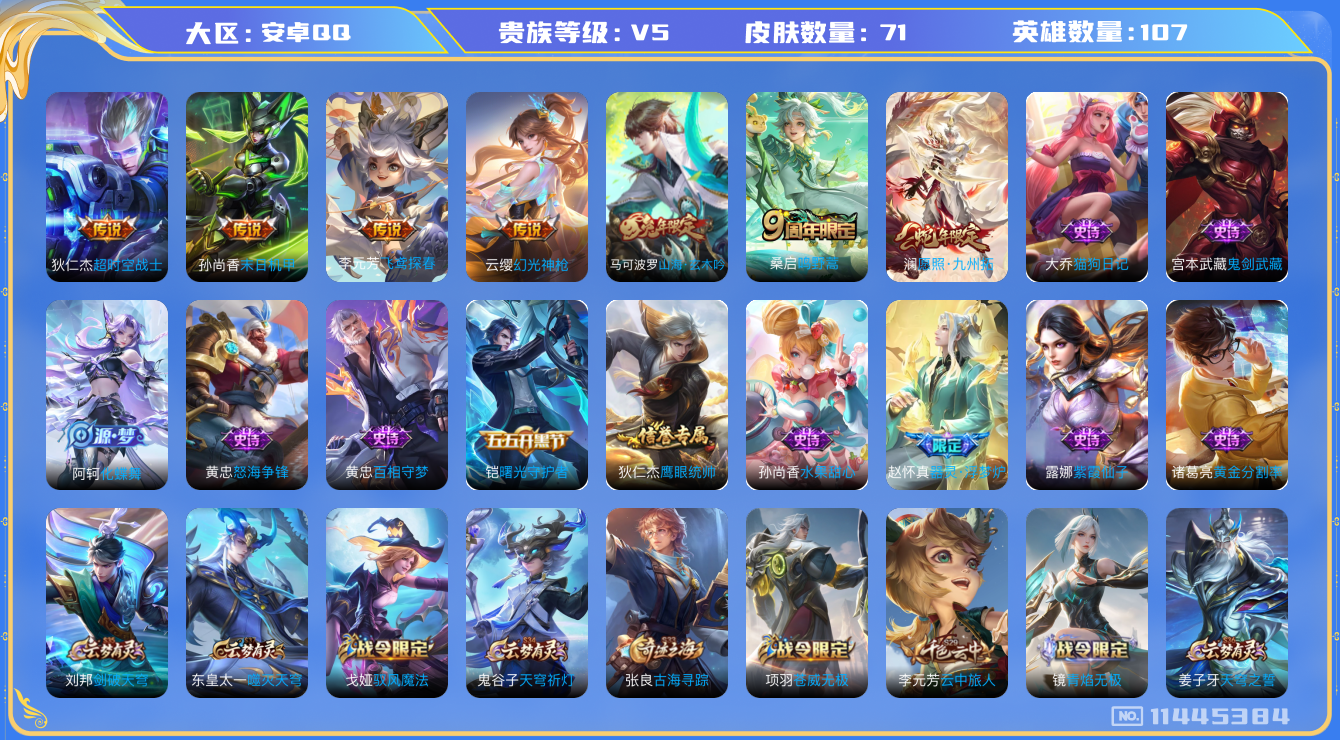 [11445384]V5 6传说 107英雄 71皮肤 可修改实名 优质装备:末日机甲-孙尚香(绿蚂蚱),飞鸢探春,超时空战士-狄仁杰 传说皮:幻光神枪 限定皮:愿照·九州拓(澜年限),鸣野蒿,山海·玄木吟(马可年限) 史诗皮:器灵·浮梦炉,化蝶舞,怒海争锋,百相守梦-黄忠,紫霞仙子,黄金分割率,猫狗日记-大乔,水果甜心,鬼剑武藏,曙光守护者,鹰眼统帅