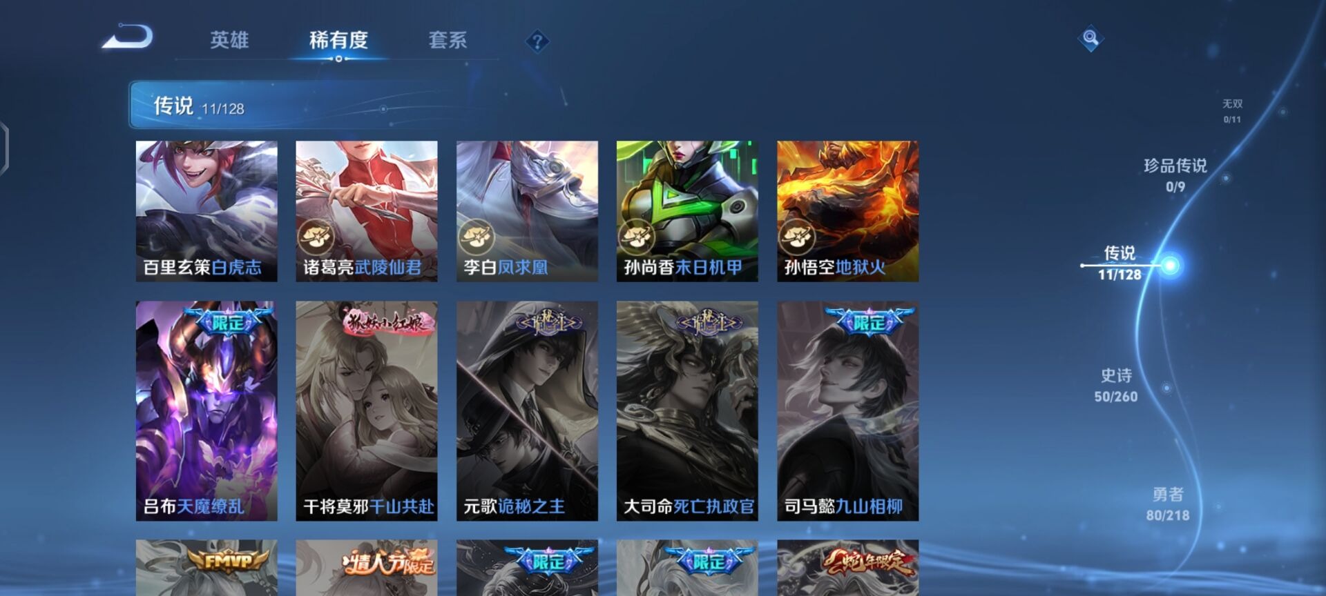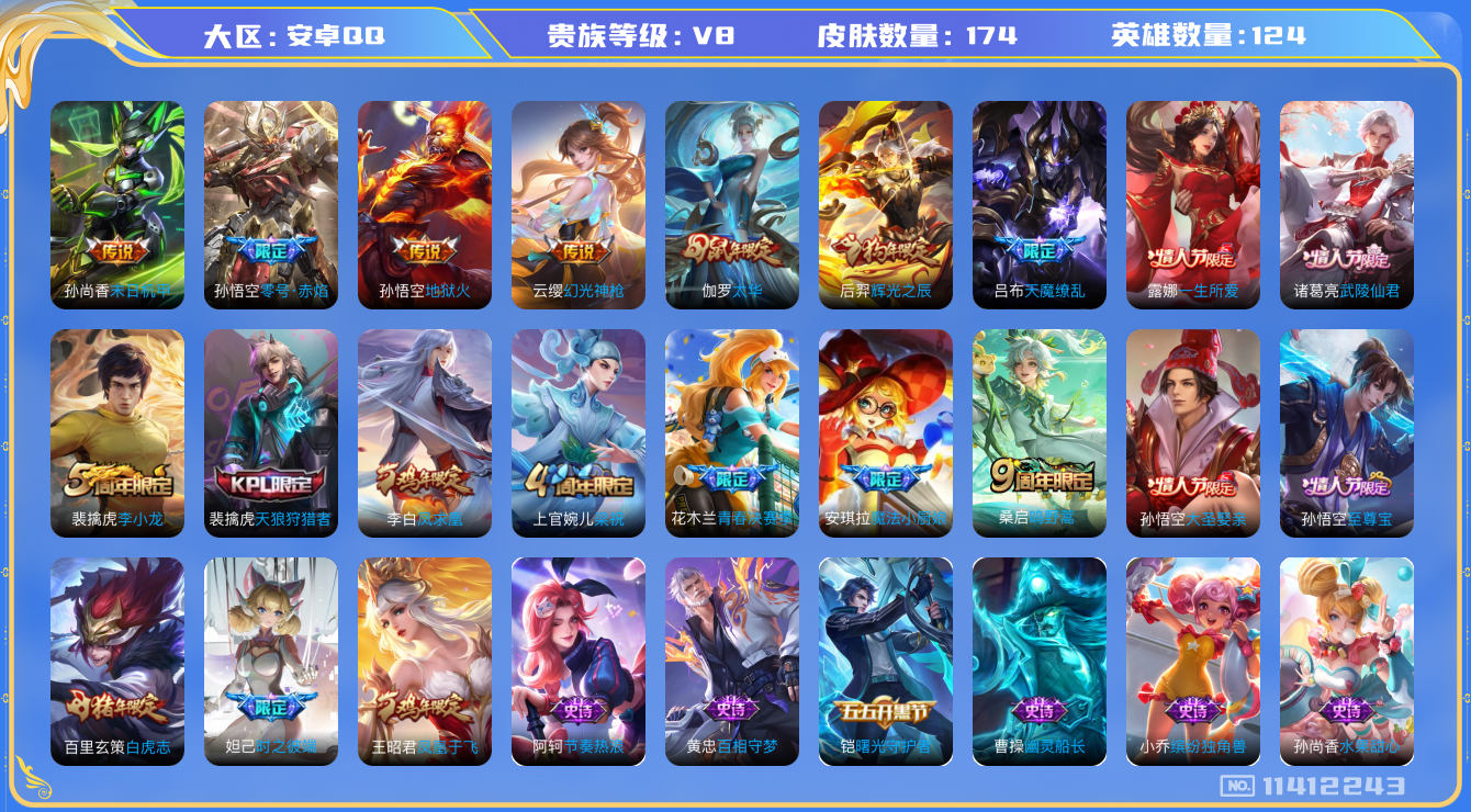 [11412243]V8 11传说 124英雄 174皮肤 可修改实名 优质装备:末日机甲-孙尚香(绿蚂蚱),地狱火,零号·赤焰 传说皮:幻光神枪 珍宝阁皮:妄想食味 限定皮:鸣野蒿,至尊宝,白虎志(电光耗子),凤求凰(白切鸡),凤凰于飞,太华(伽罗年限),武陵仙君(小桃花),时之彼端,魔法小厨娘,梁祝,天狼狩猎者,李小龙,辉光之辰,一生所爱,大圣娶亲,天魔缭乱,青春决赛季 史诗皮:百相守梦-黄忠,紫霞仙子,电玩小子(小书包),白龙吟,黄金分割率,特工魅影,千年之狐,偶像歌手,龙骑士(小龙虾),节奏热浪,修罗,女仆咖啡,摇滚巨星,水果甜心,星夜王子,功夫厨神,暗隐猎兽者,幽灵船长,鬼剑武藏,心灵战警,舞动绿茵,纤云弄巧,繁星吟游(呼啦呼啦),缤纷独角兽,逐浪之夏,曙光守护者,圣诞狂欢,圣诞恋歌,鹰眼统帅,未来纪元-赵云