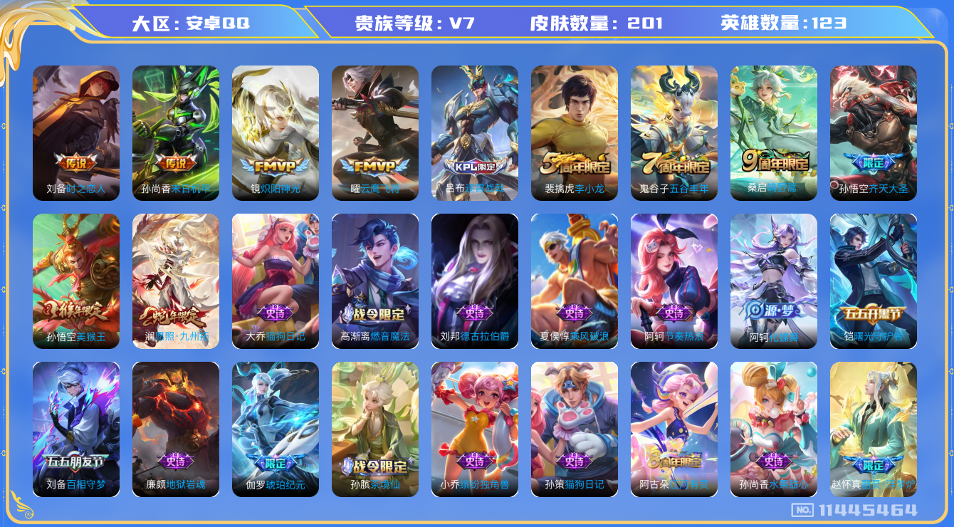 [11445464]V7 7传说 123英雄 201皮肤 可修改实名 传说皮:末日机甲-孙尚香(绿蚂蚱),云鹰飞将(小将军),炽阳神光,时之恋人-刘备(电焊工) 珍宝阁皮:女武神 限定皮:愿照·九州拓(澜年限),逐霄战戟,鸣野蒿,齐天大圣,五谷丰年,李小龙,美猴王 史诗皮:茶境仙,器灵·浮梦炉,百相守梦-百里守约,战舞者,埋骨钱,蔬乡物语(鲁班七号),超元猎域,琥珀纪元伽罗,化蝶舞,破空之剑,紫霞仙子,特工魅影,千年之狐,江河有灵,高渐离燃音魔法,偶像歌手,电玩·爆裂旋风,百相守梦(刘备),末日机甲-吕布,猫狗日记-孙策,猫狗日记-大乔,节奏热浪,女仆咖啡,摇滚巨星,水果甜心,星夜王子,德古拉伯爵,暗隐猎兽者,鬼剑武藏,心灵战警,乐园奇幻夜,地狱岩魂,缤纷独角兽,乘风破浪,逐浪之夏,水晶猎龙者,曙光守护者,金属风暴,原初追逐者,圣诞狂欢,鹰眼统帅,无心,未来纪元-赵云