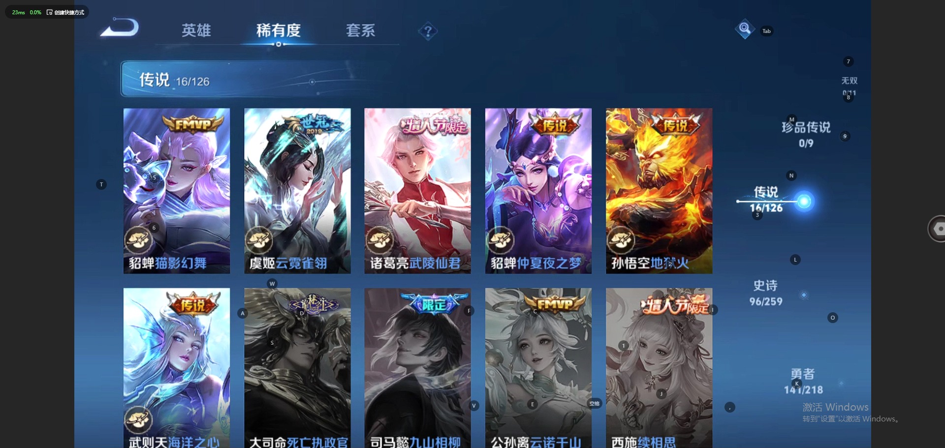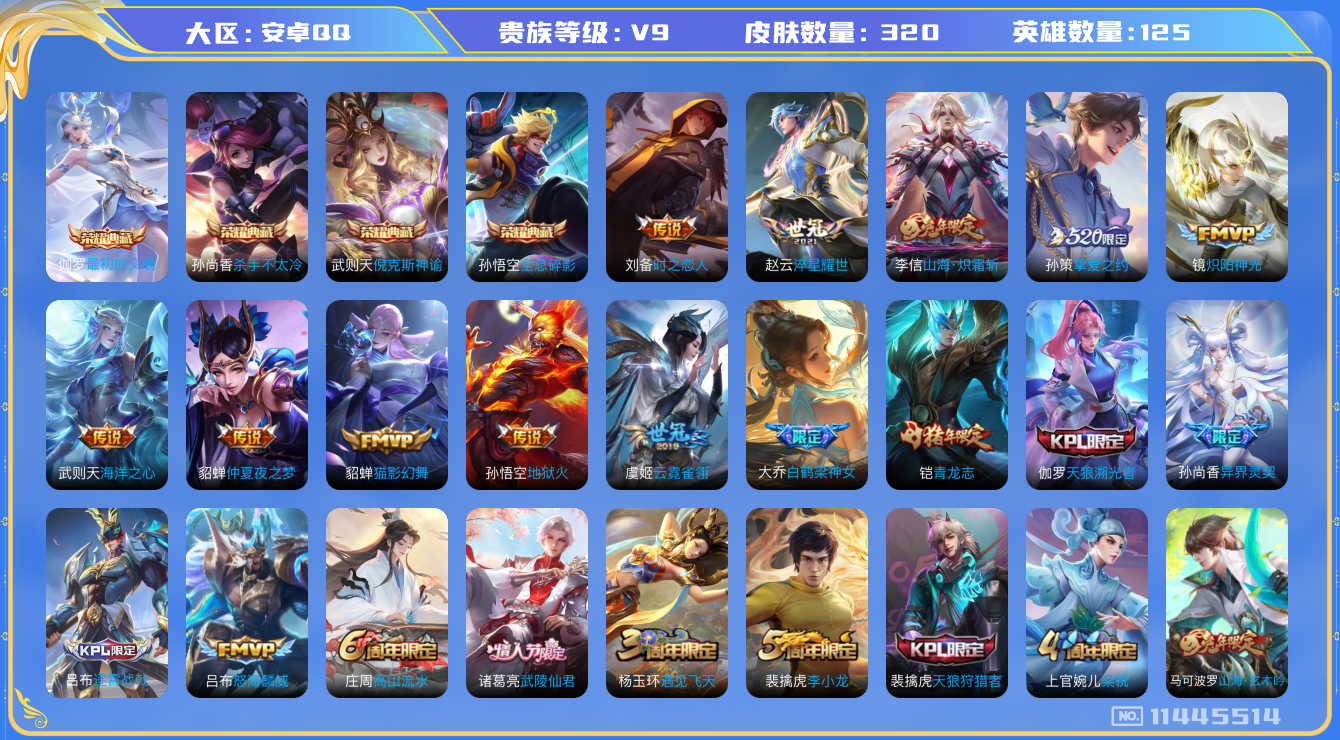 [11445514]V9 4典藏 16传说 125英雄 320皮肤 典藏英雄武则天 可修改实名 优质装备:倪克斯神谕(宇宙婆娘),杀手不太冷,全息碎影(猴子典藏),最初的交响(伽罗典藏),猫影幻舞,炽阳神光,云霓雀翎,地狱火,仲夏夜之梦(大飞蛾),海洋之心,时之恋人-刘备(电焊工),淬星耀世,挚爱之约,山海·炽霜斩(李信年限) 珍宝阁皮:优雅恋人,女武神 限定皮:愿照·岁时盈(虞姬年限),逐霄战戟,鸣野蒿,至尊宝,凤凰于飞,武陵仙君(小桃花),异界灵契(白毛香),傲雪梅枪,白鹤梁神女,神威(电光马子),遇见飞天,高山流水,怒海麟威,青龙志(铠年限),梁祝,天狼狩猎者,天狼溯光者,李小龙,猪悟能,大圣娶亲,美猴王,山海·玄木吟(马可年限) 史诗皮:器灵·浮梦炉,绮世丹青,化蝶舞,茶境仙,谪仙醉月,炽弈燎原,百相守梦-黄忠,遇见神鹿,紫霞仙子,苍穹之光,电玩小子(小书包),白龙吟,千年之狐,真我赫兹(镜),浮梦罗烟,真我赫兹(百里守约),偶像歌手,龙骑士(小龙虾),暗夜猫娘,魅语,晚萤,冰冠公主,末日机甲-吕布,猫狗日记-孙策,猫狗日记-大乔,乱世虎臣,节奏热浪,修罗,女仆咖啡,摇滚巨星,水果甜心,绅士熊喵,天才门将,星夜王子,心灵骇客,功夫厨神,德古拉伯爵,暗隐猎兽者,幽灵船长,鬼剑武藏,暗渊魔法,心灵战警,舞动绿茵,地狱岩魂,纤云弄巧,繁星吟游(呼啦呼啦),拒霜思,缤纷独角兽,乘风破浪,逐浪之夏,水晶猎龙者,曙光守护者,箭羽风息,金属风暴,原初追逐者,圣诞恋歌,鹰眼统帅,暗夜贵公子,魅力维加斯,黎明之约,赏金猎手,无心,未来纪元-赵云
