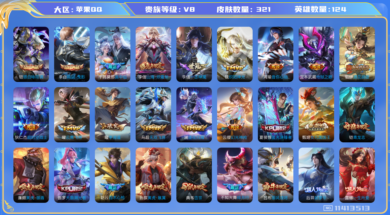 [11413513]V8 2典藏 22传说 124英雄 321皮肤 可修改实名 优质装备:鸣剑·曳影,银白咏叹调(倪克斯侍卫),云鹰飞将(小将军),炽阳神光,一念神魔,地狱之眼,音你心动-周瑜,李逍遥,超时空战士-狄仁杰,遇见胡旋,无双飞将,山海·炽霜斩(李信年限),画中仙,澜逐花归海 传说皮:幻光神枪 珍宝阁皮:妄想食味,优雅恋人,女武神 限定皮:愿照·九州拓(澜年限),鸣野蒿,凤求凰(白切鸡),武陵仙君(小桃花),寅虎·展翼(孙膑年限),绯月行,神威(电光马子),高山流水,诗剑行,匿光决锋者,降魔,五谷丰年,青龙志(铠年限),武圣,梁祝,御风骁将(吕布年限),岱宗(典韦年限),天狼溯光者,李小龙,如梦令-后羿,孙行者,一生所爱,匿光追影者,女儿国国王,寅虎·御盾(廉颇年限),寅虎·心曲(虎婆),寅虎·赤拳(老虎年限),时之祈愿-云中君,百木心枪,玉兔公主,山海·玄木吟(马可年限) 史诗皮:器灵·浮梦炉,灵蛊蚀心,星界战将,龙之律动,茶境仙,战舞者,东方月初,蒙犽顽岩魄,埋骨钱,百相守梦-黄忠,紫霞仙子,电玩小子(小书包),白龙吟,黄金分割率,特工魅影,千年之狐,永昼,魅语,高渐离燃音魔法,蒙恬荣光圣徽,无限星赏官,冰冠公主,百相守梦(刘备),末日机甲-吕布,猫狗日记-孙策,时之恋人-孙尚香,乱世虎臣,节奏热浪,修罗,女仆咖啡,摇滚巨星,水果甜心,绅士熊喵,天才门将,星夜王子,心灵骇客,时之奇旅-安琪拉,功夫厨神,德古拉伯爵,暗隐猎兽者,幽灵船长,鬼剑武藏,暗渊魔法,心灵战警,乐园奇幻夜,舞动绿茵,地狱岩魂,纤云弄巧,拒霜思,缤纷独角兽,乘风破浪,逐浪之夏,水晶猎龙者,曙光守护者,热力回旋,金属风暴,圣诞狂欢,圣诞恋歌,鹰眼统帅,魅力维加斯,黎明之约,赏金猎手,寅虎·御盾,无心,未来纪元-赵云