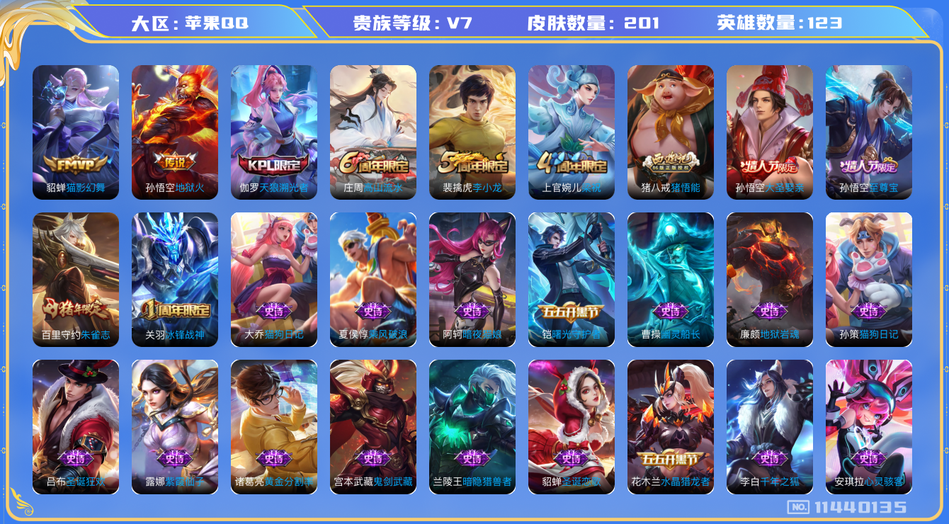 [11440135]V7 2传说 123英雄 201皮肤 可修改实名 优质装备:猫影幻舞,地狱火 珍宝阁皮:女武神 限定皮:至尊宝,高山流水,冰锋战神,梁祝,天狼溯光者,李小龙,朱雀志(守约年限),猪悟能,大圣娶亲 史诗皮:紫霞仙子,白龙吟,黄金分割率,特工魅影,千年之狐,冰冠公主,暗夜猫娘,龙骑士(小龙虾),猫狗日记-孙策,猫狗日记-大乔,女仆咖啡,心灵骇客,功夫厨神,暗隐猎兽者,幽灵船长,鬼剑武藏,乐园奇幻夜,舞动绿茵,地狱岩魂,拒霜思,乘风破浪,逐浪之夏,水晶猎龙者,曙光守护者,金属风暴,原初追逐者,圣诞狂欢,圣诞恋歌,鹰眼统帅,未来纪元-赵云
