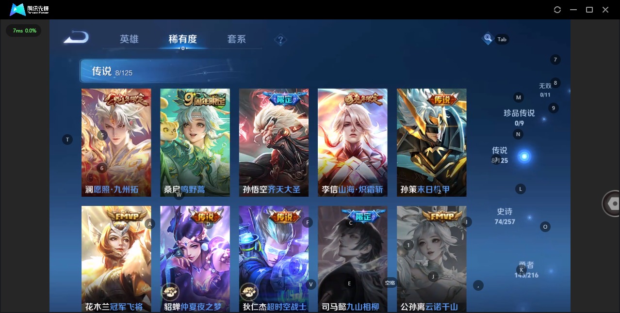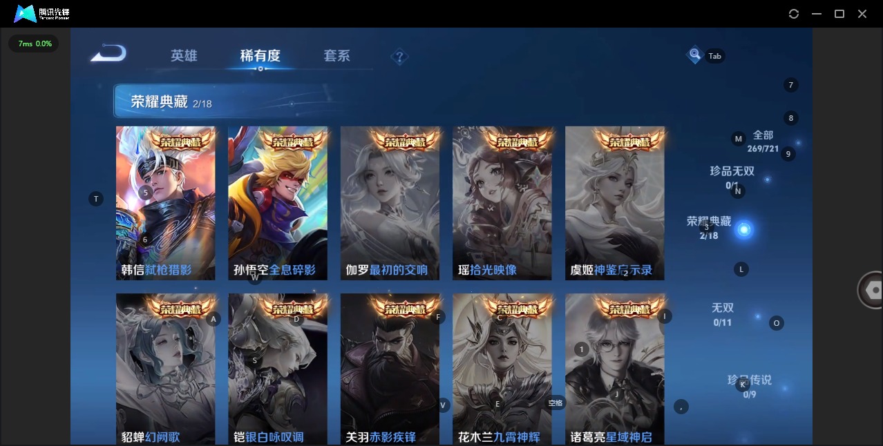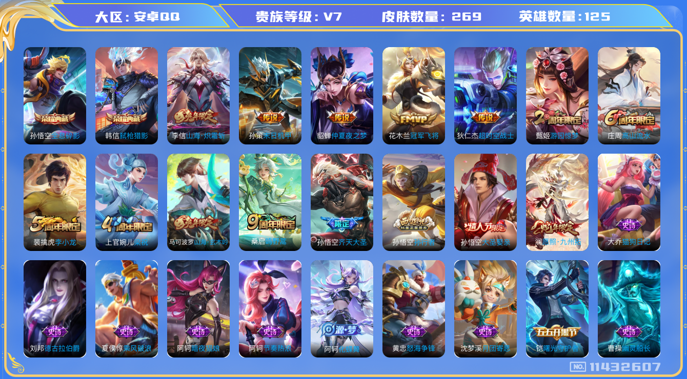 [11432607]V7 2典藏 8传说 125英雄 269皮肤 可修改实名 优质装备:全息碎影(猴子典藏),弑枪猎影(韩信典藏),冠军飞将,仲夏夜之梦(大飞蛾),超时空战士-狄仁杰,末日机甲-孙策,山海·炽霜斩(李信年限) 珍宝阁皮:蔷薇恋人,玩趣恶龙 限定皮:愿照·九州拓(澜年限),鸣野蒿,高山流水,齐天大圣,游园惊梦,梁祝,李小龙,孙行者,大圣娶亲,山海·玄木吟(马可年限) 史诗皮:芈月浮光幕影,怒海争锋,蔬乡物语(鲁班七号),化蝶舞,破空之剑,紫霞仙子,苍穹之光,电玩小子(小书包),白龙吟,黄金分割率,特工魅影,千年之狐,冰冠公主,偶像歌手,无限星赏官,魅语,暗夜猫娘,龙骑士(小龙虾),末日机甲-吕布,猫狗日记-孙策,猫狗日记-大乔,乱世虎臣,节奏热浪,修罗,女仆咖啡,摇滚巨星,水果甜心,绅士熊喵,天才门将,星夜王子,心灵骇客,功夫厨神,德古拉伯爵,暗隐猎兽者,幽灵船长,鬼剑武藏,心灵战警,天秀·启明,舞动绿茵,地狱岩魂,纤云弄巧,缤纷独角兽,乘风破浪,逐浪之夏,月团寄思,水晶猎龙者,曙光守护者,箭羽风息,金属风暴,圣诞狂欢,圣诞恋歌,鹰眼统帅,暗夜贵公子,魅力维加斯,无心,未来纪元-赵云