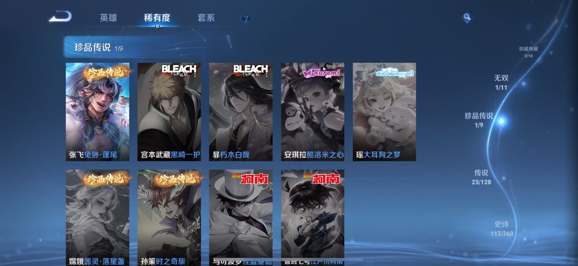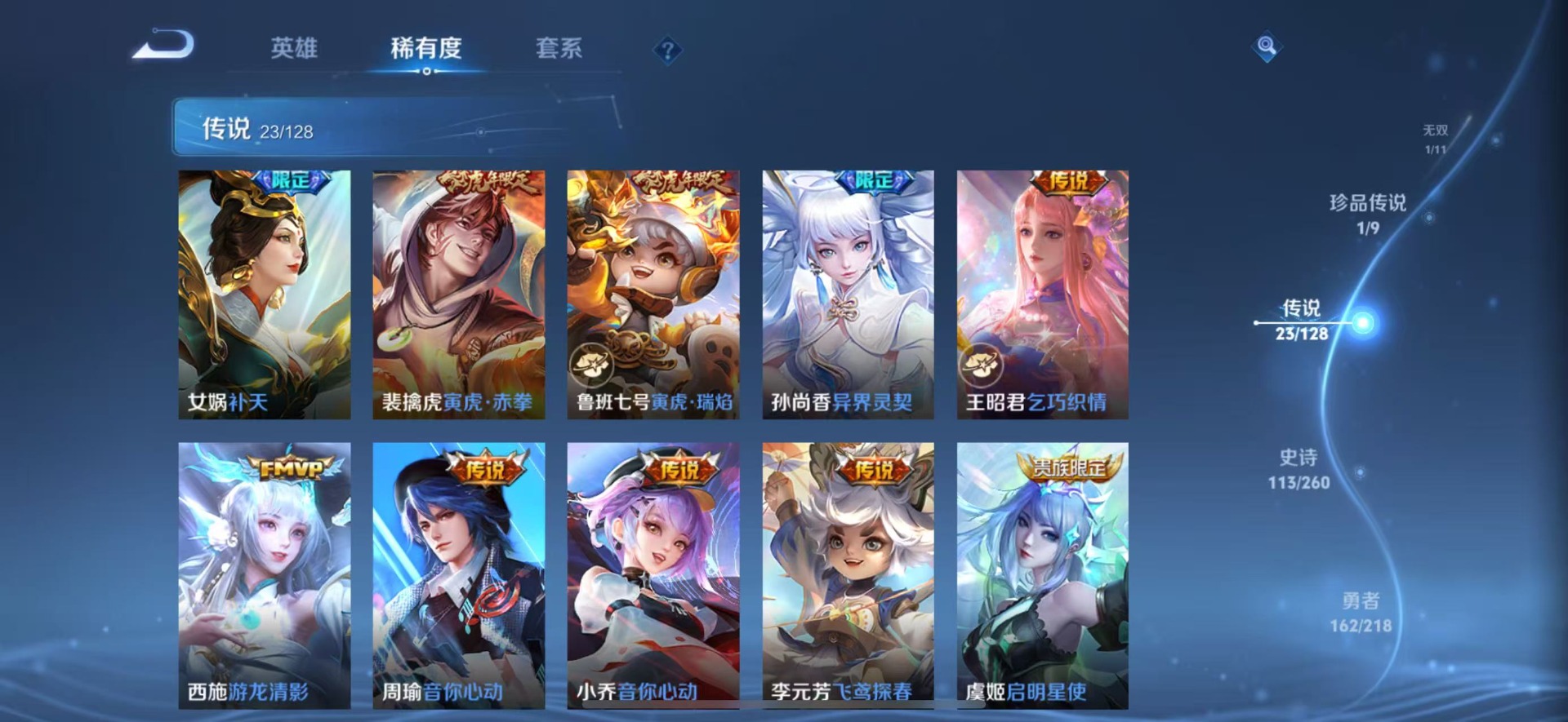 - [11294842]V7 1典藏 1无双 2珍品传说 13传说 123英雄 135皮肤 可修改实名 优质装备:鸣剑·曳影,器灵·螭龙剑,器灵·落星盏,地狱之眼,山海·炽霜斩(李信年限),燃星之曲,浮生妄 珍品传说:时之奇旅-孙策 传说皮:星之鸣奏,祥瑞亨通,幻光神枪 珍宝阁皮:女武神 限定皮:愿照·九州拓(澜年限),愿照·岁时盈(虞姬年限),愿照·山河定(司空震年限),愿照·千秋盛(女娲年限),鸣野蒿,时雨天司(水龙头),遇见飞天 史诗皮:鸭鸭历险记-刘禅,苍鳞隐世,器灵·浮梦炉,化蝶舞,龙之律动,石田雨龙,百相守梦-周瑜,茶境仙,百相守梦-百里守约,百相守梦-黄忠,紫霞仙子,千年之狐,电玩·爆裂旋风,江河有灵,雪夜绮愿(周瑜),龙骑士(小龙虾),暗夜猫娘,晚萤,末日机甲-吕布,时之恋人-孙尚香,节奏热浪,女仆咖啡,摇滚巨星,水果甜心,星夜王子,心灵骇客,幽灵船长,乐园奇幻夜,纤云弄巧,逐浪之夏,水晶猎龙者,箭羽风息,圣诞恋歌,鹰眼统帅,魅力维加斯,黎明之约