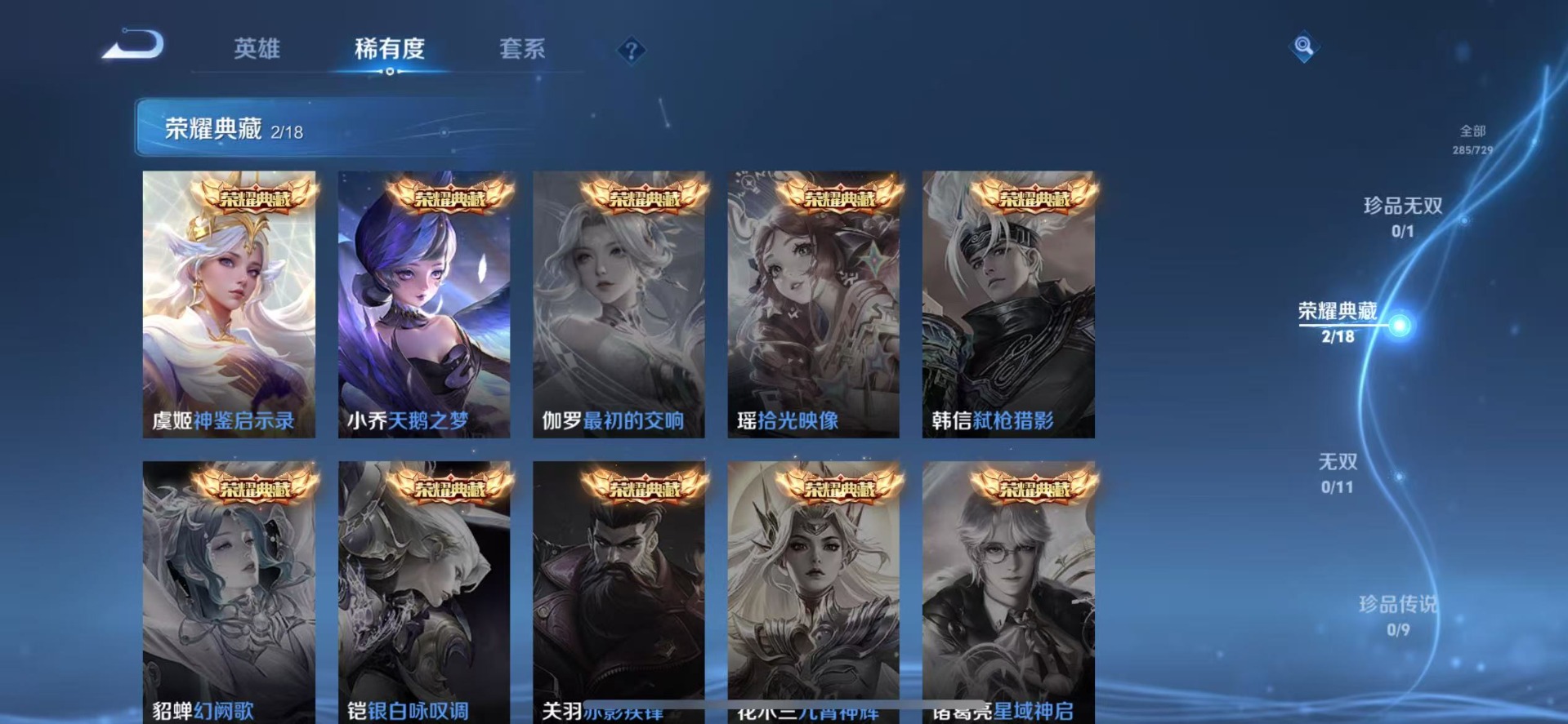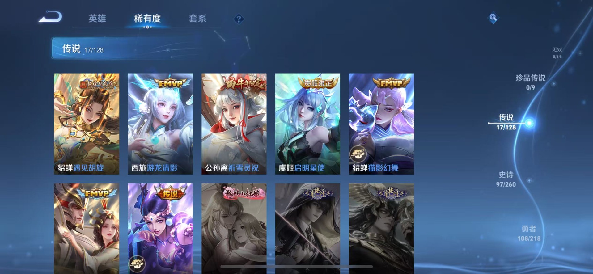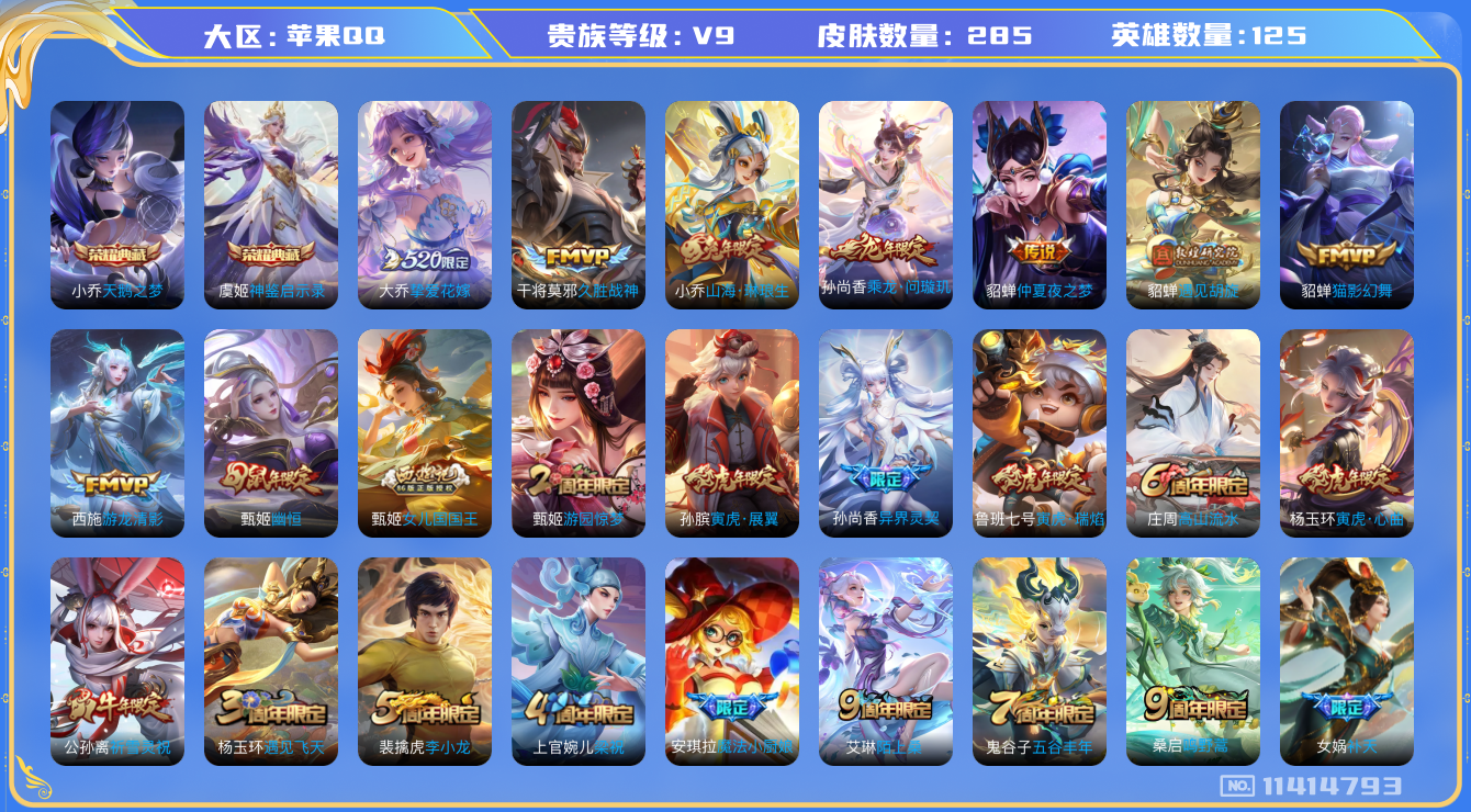 [11414793]V9 2典藏 17传说 125英雄 285皮肤 可修改实名 女号 优质装备:天鹅之梦(小乔典藏),神鉴启示录,猫影幻舞,久胜战神,仲夏夜之梦(大飞蛾),游龙清影(小青龙),遇见胡旋,挚爱花嫁,山海·琳琅生(小乔年限),涂山容容 传说皮:乘龙·问璇玑(孙尚香年限) 珍宝阁皮:蔷薇恋人,女武神 限定皮:陌上桑,鸣野蒿,凤凰于飞,异界灵契(白毛香),补天,寅虎·展翼(孙膑年限),前尘镜,时之彼端,魔法小厨娘,白晶晶,山海·碧波行(瑶年限),遇见飞天,高山流水,五谷丰年,幽恒(沐浴露),游园惊梦,梁祝,祈雪灵祝(雪兔子),李小龙,如梦令-嫦娥,热情桑巴,女儿国国王,寅虎·瑞焰(虎皮蛋子),寅虎·心曲(虎婆),时之祈愿-瑶(瑶传限),枫霜尽 史诗皮:幻珠鲛人,乘龙·聚宝船(安琪拉年限),乘龙·忆丹青(大乔年限),百相守梦-黄忠,遇见神鹿,苍穹之光,电玩小子(小书包),特工魅影,千年之狐,江河有灵,浮梦罗烟,魅语,百解令(蒙犽),高渐离燃音魔法,蒙恬荣光圣徽,冰冠公主,青蛇,偶像歌手,白蛇,晚萤,电玩·爆裂旋风,暗夜猫娘,银翎春语,龙骑士(小龙虾),猫狗日记-孙策,猫狗日记-大乔,乱世虎臣,节奏热浪,修罗,女仆咖啡,摇滚巨星,水果甜心,绅士熊喵,天才门将,星夜王子,心灵骇客,功夫厨神,德古拉伯爵,幽灵船长,鬼剑武藏,舞动绿茵,地狱岩魂,诗语江南,纤云弄巧,繁星吟游(呼啦呼啦),拒霜思,缤纷独角兽,乘风破浪,逐浪之夏,金属风暴,原初追逐者,圣诞狂欢,圣诞恋歌,鹰眼统帅,暗夜贵公子,魅力维加斯,黎明之约,奇遇舞章,无心,未来纪元-赵云