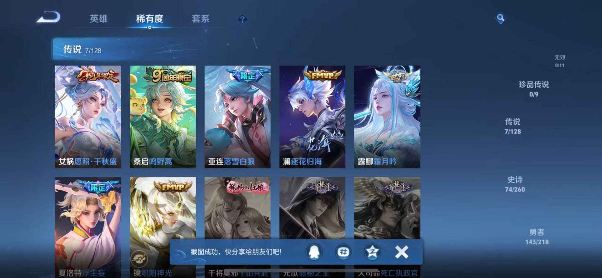 - [11295116]V7 7传说 124英雄 202皮肤 可修改实名 优质装备:黄金狮子座,黄金射手座,末日机甲-孙尚香(绿蚂蚱),地狱火,仲夏夜之梦(大飞蛾),地狱之眼,超时空战士-狄仁杰 珍宝阁皮:女武神 限定皮:高山流水,五谷丰年,梁祝,天狼狩猎者,李小龙,猪悟能,大圣娶亲 史诗皮:石田雨龙,百相守梦-黄忠,紫霞仙子,黄金分割率,特工魅影,千年之狐,龙骑士(小龙虾),冰冠公主,末日机甲-吕布,猫狗日记-孙策,乱世虎臣,节奏热浪,女仆咖啡,摇滚巨星,水果甜心,心灵骇客,功夫厨神,暗隐猎兽者,幽灵船长,鬼剑武藏,纤云弄巧,繁星吟游(呼啦呼啦),拒霜思,缤纷独角兽,乘风破浪,逐浪之夏,水晶猎龙者,曙光守护者,金属风暴,原初追逐者,鹰眼统帅,黎明之约,无心,未来纪元-赵云