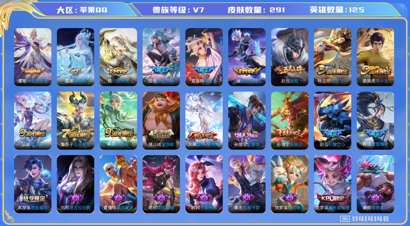 [11414148]V7 1典藏 7传说 125英雄 291皮肤 可修改实名 优质装备:神鉴启示录,炽阳神光,浮生妄,霜月吟,澜逐花归海 传说皮:落雪白狼 珍宝阁皮:妄想食味,优雅恋人,蔷薇恋人 限定皮:愿照·千秋盛(女娲年限),陌上桑,鸣野蒿,至尊宝,傲雪梅枪,遇见飞天,五谷丰年,龙胆,李小龙,猪悟能,引擎之心,美猴王 史诗皮:器灵·浮梦炉,星界战将,撼地雄心,破空之剑,战舞者,东方月初,埋骨钱,芈月浮光幕影,决胜骁骑,蔬乡物语(鲁班七号),百相守梦-百里守约,百相守梦-黄忠,特工魅影,千年之狐,江河有灵,匿光侦查者,鹤归松栖(赵怀真),雪夜绮愿(周瑜),真我赫兹(镜),百解令(蒙犽),高渐离燃音魔法,蒙恬荣光圣徽,匿光破解者,偶像歌手,暗夜猫娘,末日机甲-吕布,猫狗日记-孙策,节奏热浪,修罗,女仆咖啡,摇滚巨星,水果甜心,天才门将,星夜王子,心灵骇客,德古拉伯爵,暗隐猎兽者,鬼剑武藏,天秀·启明,纤云弄巧,拒霜思,缤纷独角兽,乘风破浪,逐浪之夏,月团寄思,水晶猎龙者,金属风暴,原初追逐者,圣诞狂欢,鹰眼统帅,魅力维加斯,赏金猎手,无心,未来纪元-赵云