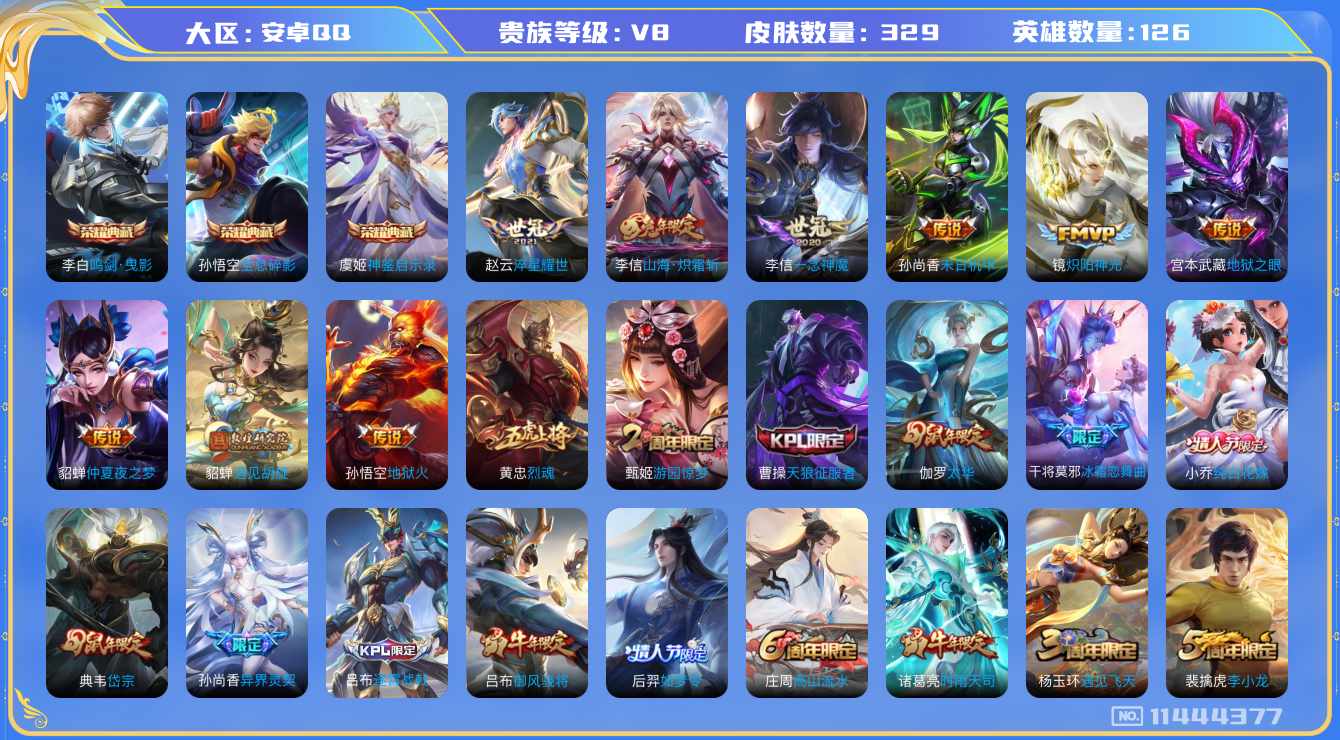 - [11824020]V7 3传说 126英雄 230皮肤 典藏英雄武则天 安全保护中 钱包无法更改 可修改实名 赵怀真小国标 传说皮:黄金射手座,云霓雀翎 珍宝阁皮:蔷薇恋人,玩趣恶龙 限定皮:逐霄战戟,鸣野蒿,五谷丰年,梁祝 史诗皮:星界战将,茶境仙,器灵·浮梦炉,鸭鸭历险记-刘禅,龙之律动,百相守梦-百里守约,蒙犽顽岩魄,琥珀纪元伽罗,化蝶舞,破空之剑,紫霞仙子,特工魅影,千年之狐,江河有灵,高渐离燃音魔法,百解令(蒙犽),蒙恬荣光圣徽,冰冠公主,偶像歌手,电玩·爆裂旋风,末日机甲-吕布,猫狗日记-孙策,乱世虎臣,节奏热浪,女仆咖啡,摇滚巨星,水果甜心,绅士熊喵,天才门将,星夜王子,德古拉伯爵,暗隐猎兽者,幽灵船长,鬼剑武藏,心灵战警,乐园奇幻夜,舞动绿茵,地狱岩魂,纤云弄巧,缤纷独角兽,乘风破浪,逐浪之夏,月团寄思,水晶猎龙者,金属风暴,原初追逐者,圣诞狂欢,圣诞恋歌,鹰眼统帅,暗夜贵公子,魅力维加斯,黎明之约,未来纪元-赵云