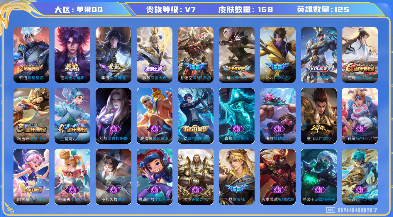 [11444897]V7 1典藏 5传说 125英雄 168皮肤 可修改实名 优质装备:弑枪猎影(韩信典藏),云鹰飞将(小将军),一念神魔,零号·赤焰,玄雷天君 传说皮:铠冥王哈迪斯 珍宝阁皮:蔷薇恋人 限定皮:逐霄战戟,遇见飞天,高山流水,梁祝,百木心枪 史诗皮:撼地雄心,破空之剑,蒙犽顽岩魄,埋骨钱,苍穹之光,电玩小子(小书包),特工魅影,千年之狐,江河有灵,真我赫兹(百里守约),魅语,百解令(蒙犽),猫狗日记-孙策,乱世虎臣,摇滚巨星,水果甜心,星夜王子,心灵骇客,功夫厨神,德古拉伯爵,暗隐猎兽者,幽灵船长,鬼剑武藏,心灵战警,乘风破浪,逐浪之夏,水晶猎龙者,曙光守护者,金属风暴,圣诞恋歌,鹰眼统帅,魅力维加斯,未来纪元-赵云