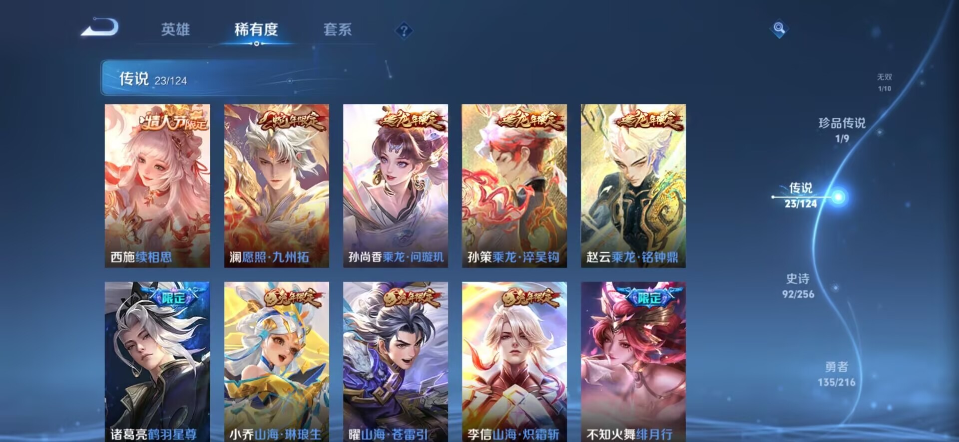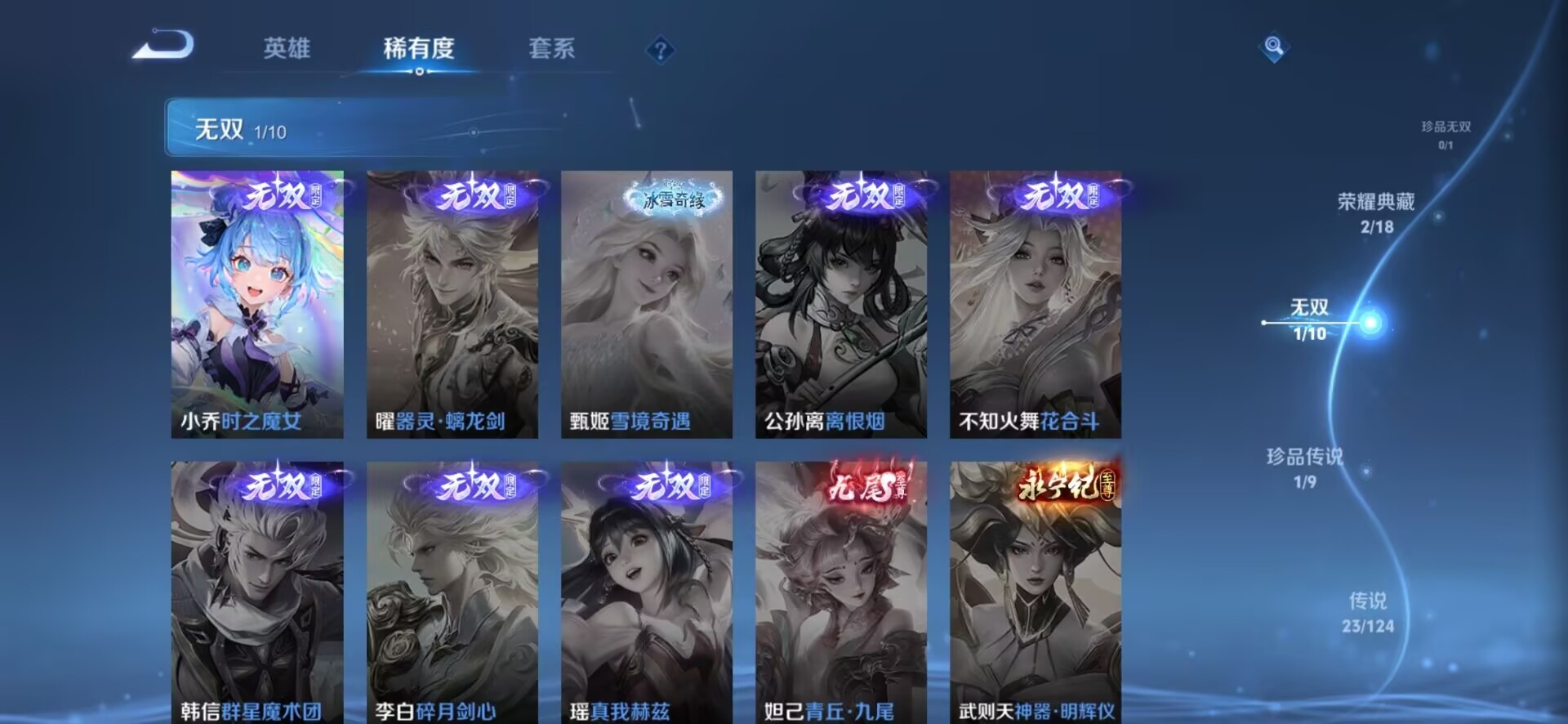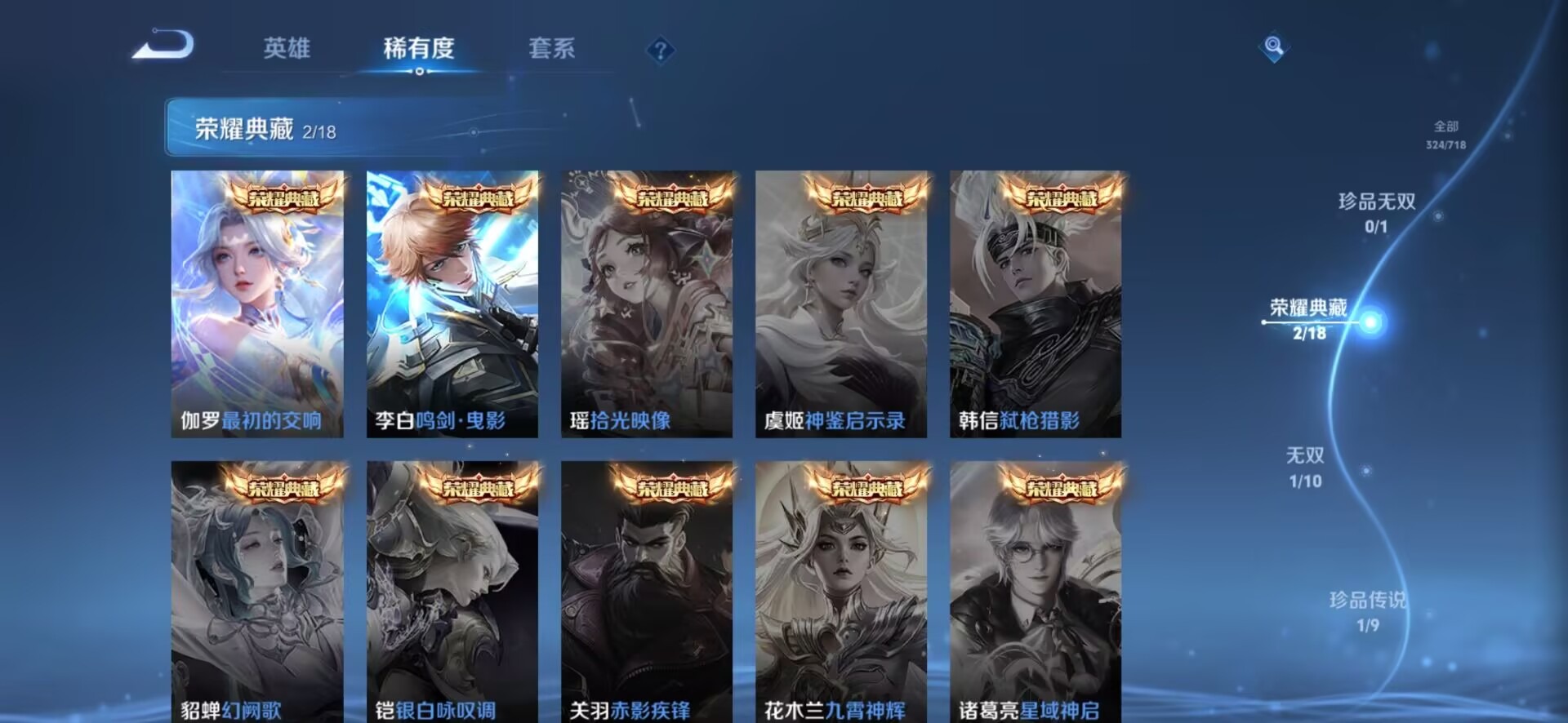 黄忠烈魂,张飞虎魄,不知火舞绯月行,诸葛亮时雨天司,公孙离祈雪灵祝,杨玉环寅虎·心曲,裴擒虎李小龙,上官婉儿梁祝,花木兰青春决赛季,马可波罗山海·玄木吟,孙悟空孙行者,雅典娜神奇女侠,韩信飞衡,百里守约朱雀志,瑶山海·碧波行,澜愿照·九州拓,王昭君凤凰于飞