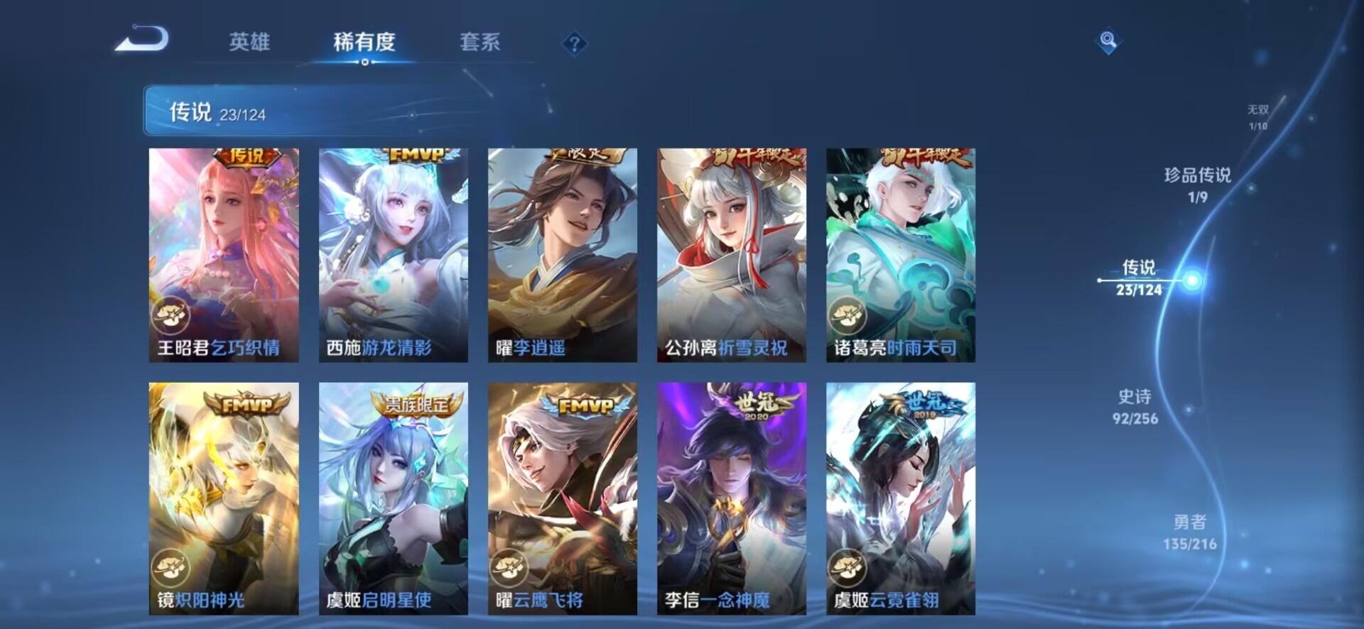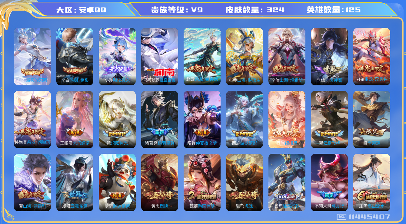 - PX_2113562-实名: 可修改 贵族等级: V9 英雄数: 124 皮肤数: 317 荣耀水晶: 活力突击,杀手不太冷,全息碎影 星传说: 未来机甲,幽冥之眼,幽冥火,金色仲夏夜 传说皮: 黄金狮子座,云鹰飞将,绛天战甲,猫影幻舞,久胜战神,一念神魔,末日机甲-孙尚香,地狱火,仲夏夜之梦,零号·赤焰,地狱之眼,乞巧织情,山海·炽霜斩,追逃游戏(亚瑟),追逃游戏(安琪拉) 限定皮: 冰锋战神,