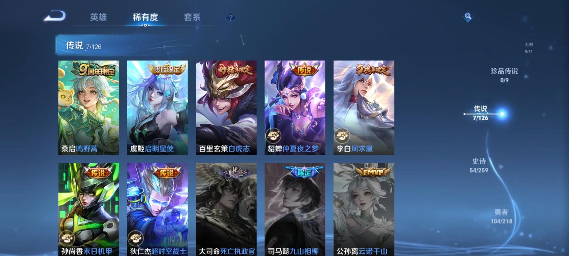 - [11883594]V10 7典藏 1珍品无双 5无双 6珍品传说 88传说 126英雄 570皮肤 典藏英雄武则天 可修改实名 优质装备:馥梦繁花,天鹅之梦(小乔典藏),倪克斯神谕(宇宙婆娘),九霄神辉(木兰典藏),赤影疾锋,幻阙歌(貂蝉典藏),青丘·九尾(妲己无双),韩信群星魔术团(韩信无双),花合斗,离恨烟(公孙离无双),拾光映像(瑶典藏),雪境奇遇-甄姬,最初的交响(伽罗典藏),怪盗基德,器灵·落星盏,酷洛米之心,大耳狗之梦,朽木白哉,黑崎一护,黄金狮子座,黄金射手座,冠军飞将,云鹰飞将(小将军),绛天战甲(鸡嘴战神),黄金白羊座,猫影幻舞,久胜战神,炽阳神光,一念神魔,云霓雀翎,末日机甲-孙尚香(绿蚂蚱),地狱火,仲夏夜之梦(大飞蛾),音你心动-小乔,零号·赤焰,海洋之心,地狱之眼,飞鸢探春,音你心动-周瑜,胖达荣荣,乞巧织情,时之恋人-刘备(电焊工),游龙清影(小青龙),淬星耀世,超时空战士-狄仁杰,遇见胡旋,末日机甲-孙策,花朝如约(花篮子),挚爱之约,挚爱花嫁,无双飞将,音你闪耀(rap皮),碎云,天秀幻梦,山海·琳琅生(小乔年限),炽翼辉光(娃娃菜牛角包),燃星之曲,浮生妄,记忆之芯(机甲兔),青丘·九尾,灼幽烈阳,妄想实况,妄想奇谈,惊梅引,遇见神鼓,大乔-时之奇旅,永恒水手月亮,小动物乐团,霜月吟,澜逐花归海,艾琳觅芳踪,金乌负日,黄金天蝎座,云中君群星魔术团,朵莉亚心动手记,牧神诗旅,诡秘之主,千山共赴,涂山容容 传说皮:貂蝉曦玄引,典韦战鼓燎原,落雪白狼,死亡执政官,九山相柳,云诺千山,铠冥王哈迪斯,续相思,星之鸣奏,幻光神枪 珍宝阁皮:妄想食味,优雅恋人 限定皮:愿照·九州拓(澜年限),愿照·福禄聚(蔡文姬年限),愿照·岁时盈(虞姬年限),愿照·山河定(司空震年限),愿照·众生和(妲己年限),愿照·千秋盛(女娲年限),逐霄战戟,映山客,陌上桑,鸣野蒿,夏侯惇霜北刀,至尊宝,凤凰于飞,太华(伽罗年限),异界灵契(白毛香),傲雪梅枪,寅虎·展翼(孙膑年限),前尘镜,星穹之声,时之彼端,白鹤梁神女,魔法小厨娘,白晶晶,时雨天司(水龙头),神威(电光马子),山海·碧波行(瑶年限),瑞麟志(木兰年限),至美·乘鲤谣,至美·化雀舞,遇见飞天,高山流水,诗剑行,怒海麟威,降魔,五谷丰年,游园惊梦,梁祝,御风骁将(吕布年限),逐梦之星,岱宗(典韦年限),天狼溯光者,虎