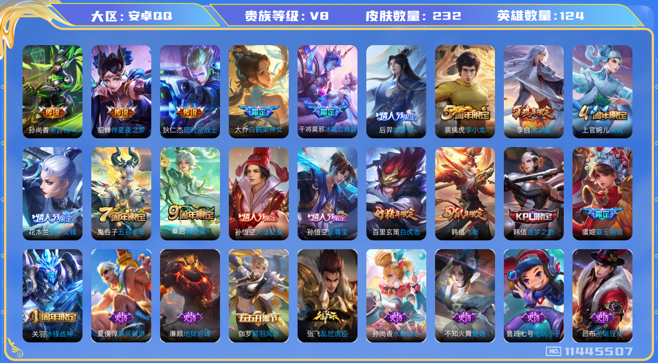 [11445507]V8 7传说 124英雄 232皮肤 可修改实名 优质装备:末日机甲-孙尚香(绿蚂蚱),仲夏夜之梦(大飞蛾),超时空战士-狄仁杰 珍宝阁皮:女武神 限定皮:鸣野蒿,至尊宝,白虎志(电光耗子),凤求凰(白切鸡),白鹤梁神女,飞衡(韩信年限),五谷丰年,冰锋战神,梁祝,李小龙,逐梦之影,如梦令-后羿,霸王别姬-虞姬,默契交锋-花木兰,大圣娶亲,冰霜恋舞曲 史诗皮:电玩小子(小书包),黄金分割率,特工魅影,千年之狐,电玩·爆裂旋风,魅语,无限星赏官,乱世虎臣,修罗,女仆咖啡,水果甜心,星夜王子,心灵骇客,功夫厨神,暗隐猎兽者,鬼剑武藏,地狱岩魂,纤云弄巧,繁星吟游(呼啦呼啦),乘风破浪,逐浪之夏,水晶猎龙者,箭羽风息,金属风暴,原初追逐者,圣诞狂欢,圣诞恋歌,鹰眼统帅,魅力维加斯,未来纪元-赵云