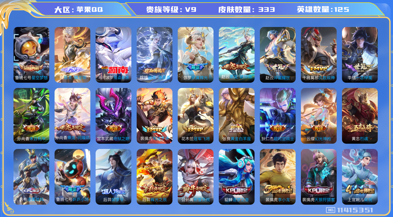 [11415351]V9 1典藏 1无双 2珍品传说 19传说 125英雄 333皮肤 可修改实名 优质装备:星空梦想(太空人),器灵·螭龙剑,怪盗基德,器灵·落星盏,冠军飞将,黄金白羊座,久胜战神,一念神魔,末日机甲-孙尚香(绿蚂蚱),地狱之眼,淬星耀世,超时空战士-狄仁杰,炽翼辉光(娃娃菜牛角包) 传说皮:乘龙·问璇玑(孙尚香年限),乘龙·铭钟鼎(赵云年限),祥瑞亨通,幻光神枪 珍宝阁皮:蔷薇恋人,玩趣恶龙 限定皮:愿照·九州拓(澜年限),逐霄战戟,鸣野蒿,至尊宝,白晶晶,诗剑行,齐天大圣,降魔,梁祝,天狼狩猎者,逐梦之星,烈魂,逐梦之音,祈雪灵祝(雪兔子),天狼绘梦者,李小龙,逐梦之影,辉光之辰,如梦令-后羿,霸王别姬-虞姬,孙行者,乒乒小将,山海·玄木吟(马可年限) 史诗皮:鸭鸭历险记-刘禅,器灵·浮梦炉,化蝶舞,灵蛊蚀心,龙之律动,蔬乡物语(鲁班七号),百相守梦-百里守约,星界特工,百相守梦-黄忠,遇见神鹿,紫霞仙子,苍穹之光,电玩小子(小书包),黄金分割率,特工魅影,千年之狐,永昼,魅语,蒙恬荣光圣徽,无限星赏官,冰冠公主,青蛇,偶像歌手,晚萤,电玩·爆裂旋风,龙骑士(小龙虾),末日机甲-吕布,猫狗日记-孙策,猫狗日记-大乔,时之恋人-孙尚香,乱世虎臣,节奏热浪,修罗,女仆咖啡,摇滚巨星,水果甜心,绅士熊喵,天才门将,星夜王子,心灵骇客,功夫厨神,德古拉伯爵,暗隐猎兽者,幽灵船长,鬼剑武藏,暗渊魔法,心灵战警,乐园奇幻夜,天秀·启明,舞动绿茵,地狱岩魂,诗语江南,纤云弄巧,缤纷独角兽,乘风破浪,逐浪之夏,水晶猎龙者,曙光守护者,箭羽风息,唤灵魅影,金属风暴,圣诞狂欢,圣诞恋歌,鹰眼统帅,暗夜贵公子,魅力维加斯,赏金猎手,奇遇舞章,无心,未来纪元-赵云