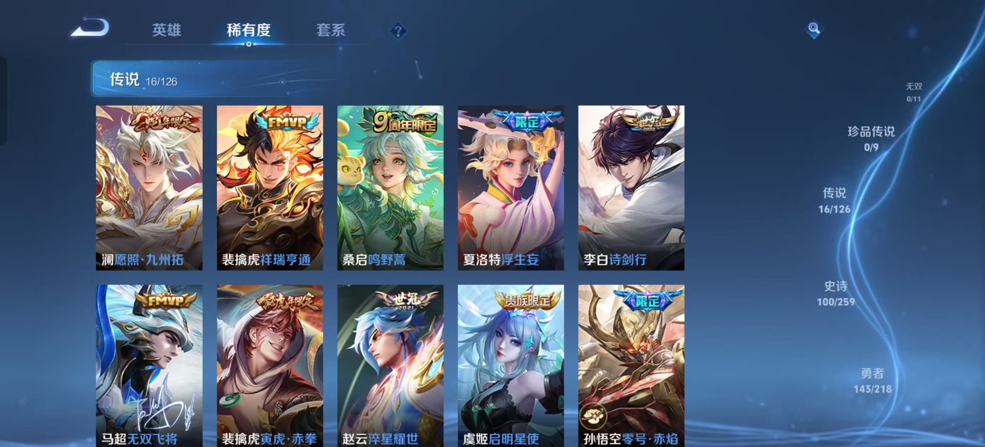 - PX_2084946-贵族等级: V4 英雄数: 89 皮肤数: 65 传说皮: 山海·炽霜斩 限定皮: 孙行者,五谷丰年,鸣野蒿